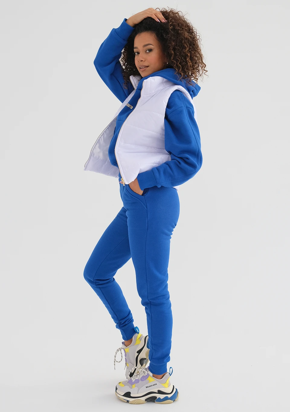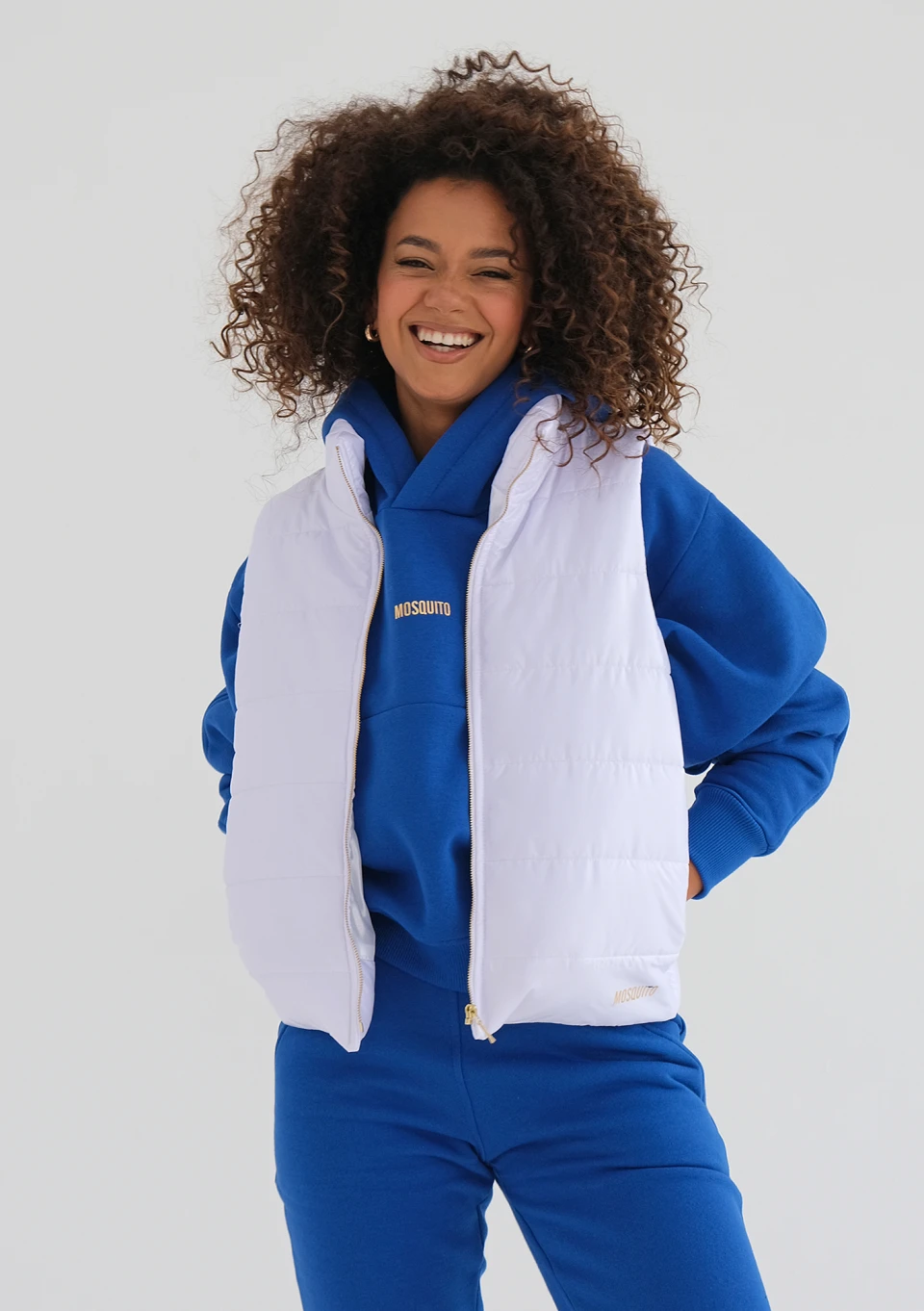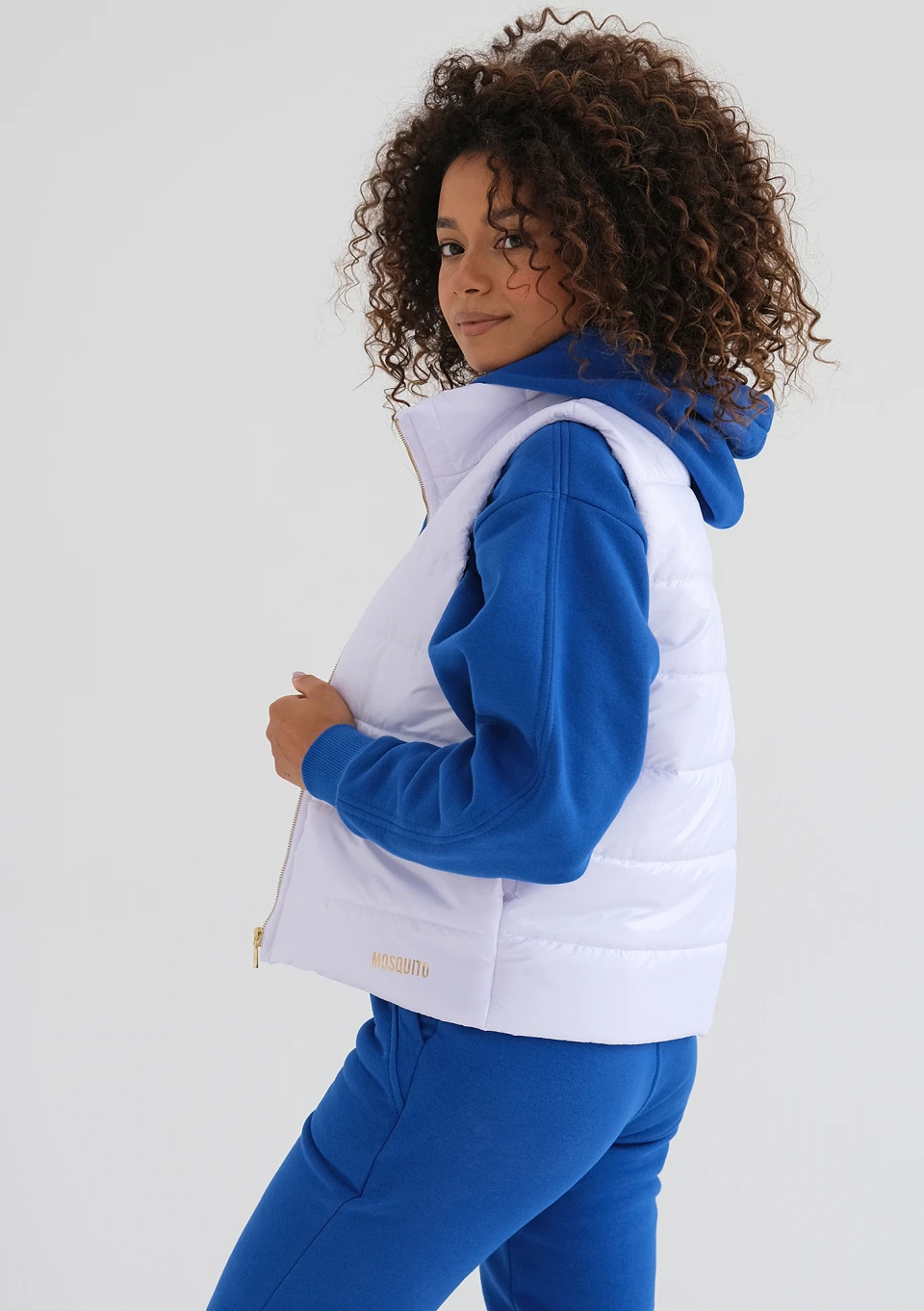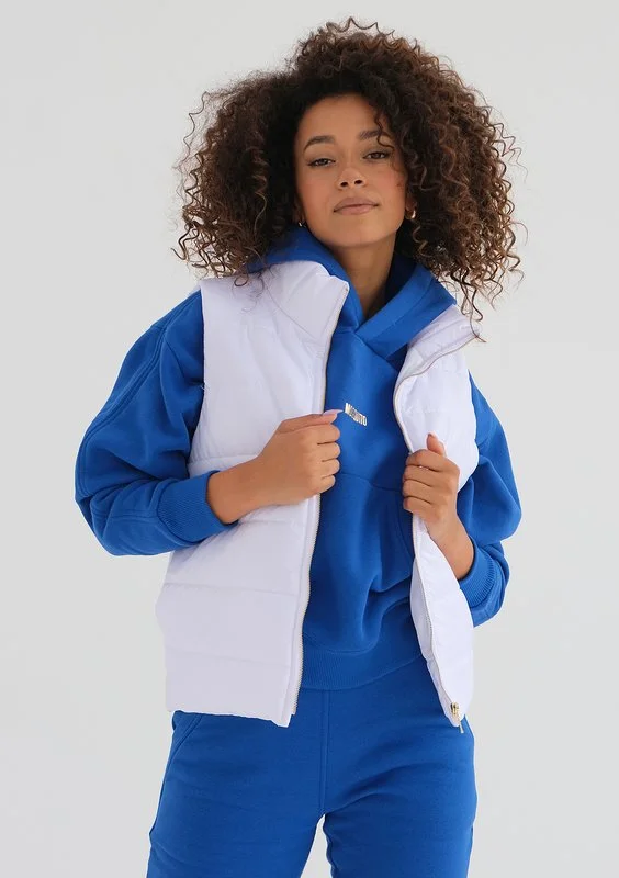 Krótki bezrękawnik damski to lekki fason na jesienną pogodę. Stanowi dodatkowe, ciepłe okrycie, świetnie uzupełni dresy lub swetry z kapturem. Model został zaprojektowany w klasycznej bieli, która pięknie komponuje się ze złotymi akcentami loga i suwaka.