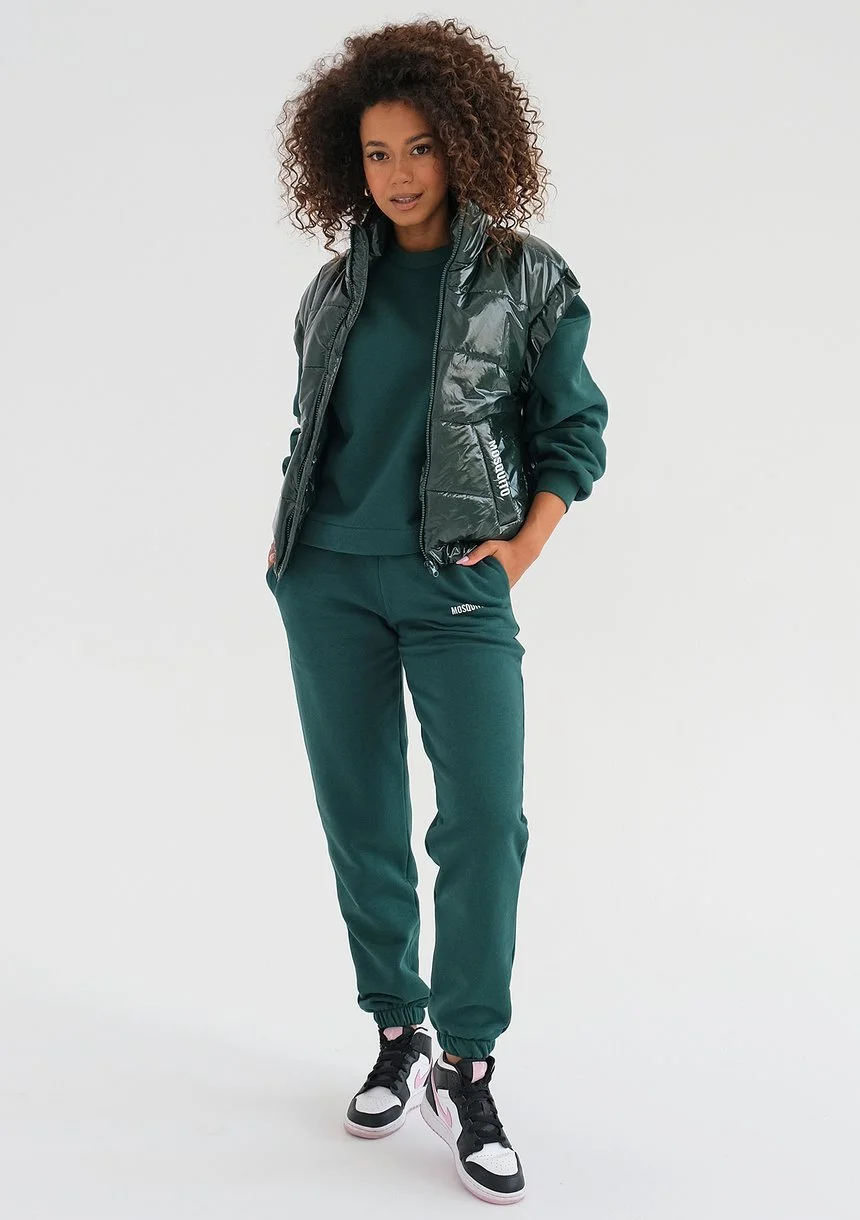 Zielony bezrękawnik zakrywa szyję wysoką stójką. Został zaprojektowany z myślą o stylizacjach w sportowym stylu, a w naszej kolekcji dresów damskich z pewnością dopasujesz do niego pasujący komplet. Produkt został wykonany pod czujnym okiem projektantki Alicji Komar, która przygotowała go w rozmiarach XS – L. W produkcji został zastosowany impregnowany, wodoszczelny materiał o mocno błyszczącej fakturze. Nasze bezrękawniki damskie posiadają kieszenie i solidny zamek błyskawiczny. Prezentowany model posiada białe logo marki.