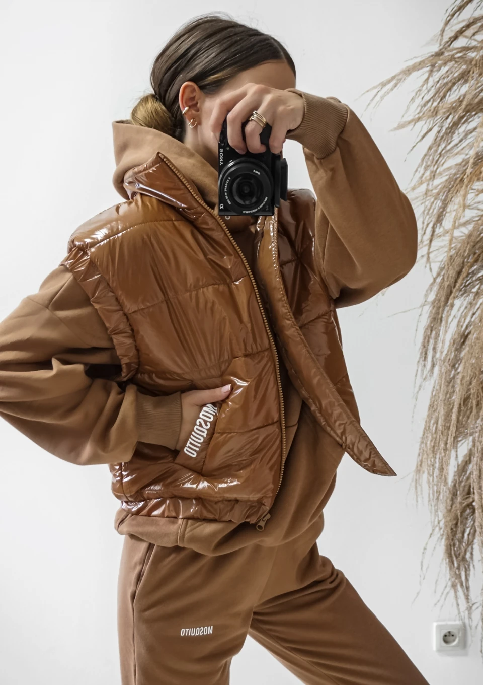 Ciepły i lekki bezrękawnik damski wykonany w karmelowym kolorze, z impregnowanej tkaniny o mocno błyszczącej fakturze. Zapewni Ci nie tylko stylowy akcent na jesienne chłody, ale skutecznie osłoni przed wiatrem, zimnem i wilgocią. Model posiada praktyczne zapięcie na zamek, kieszenie i wysoką stójkę.