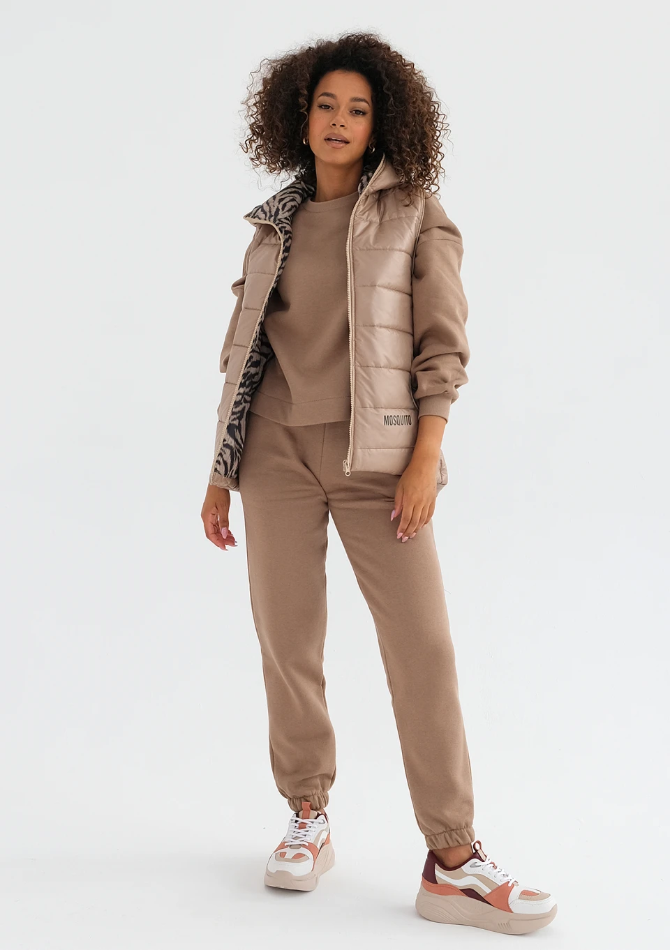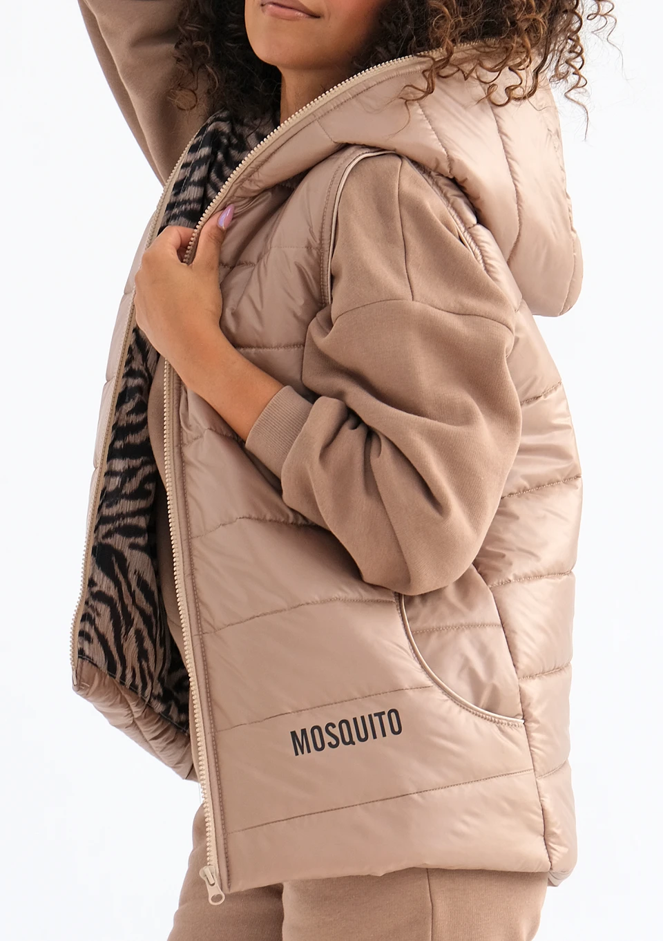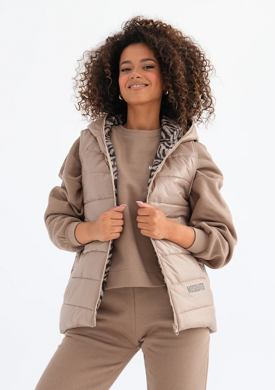 Beżowy bezrękawnik damski to model doskonale skrojony, nieco dłuższy z tyłu. Wygodnie lekki, a zarazem ciepły, z dodatkiem praktycznych kieszeni i kaptura.