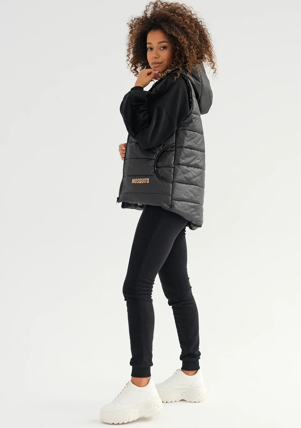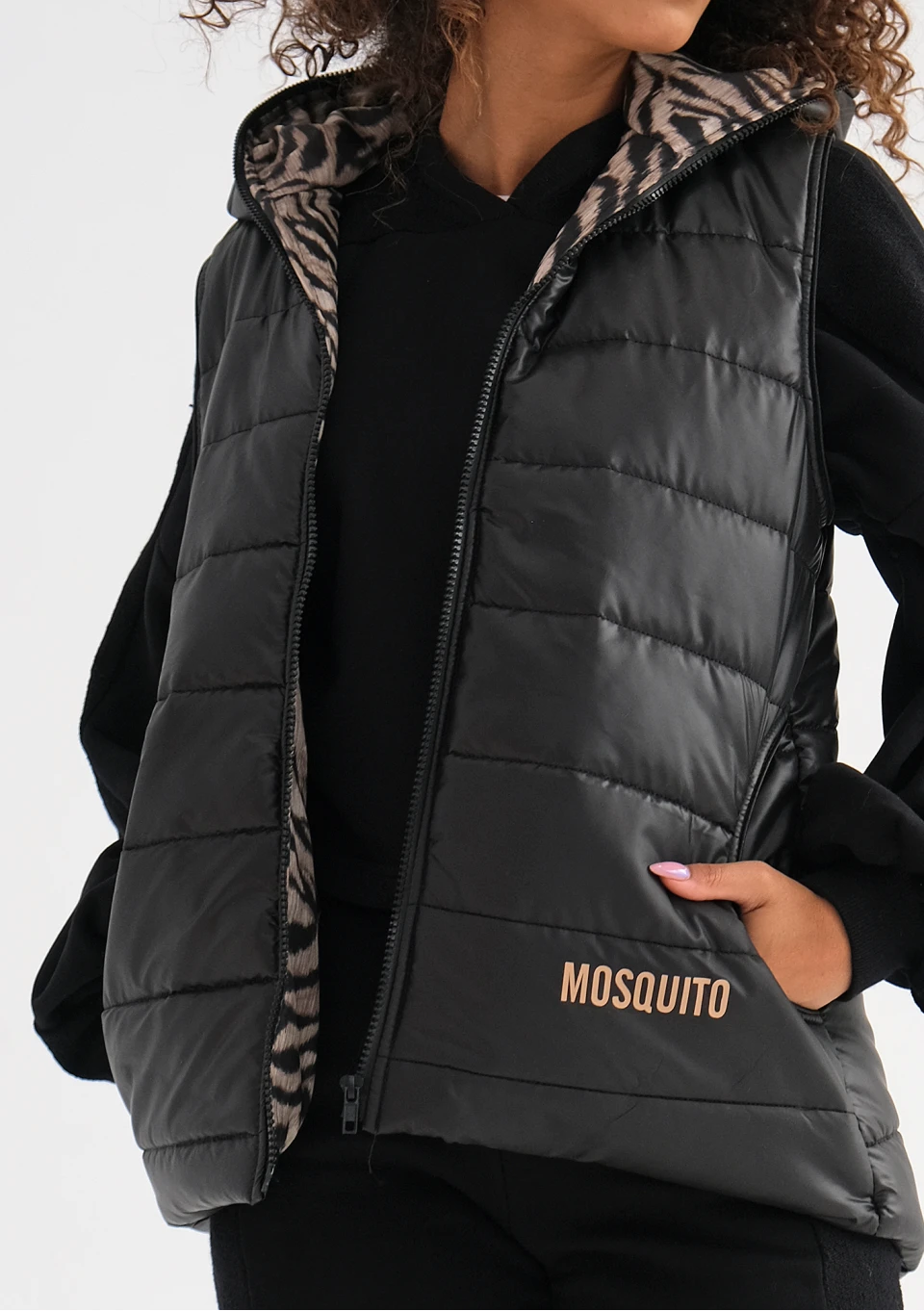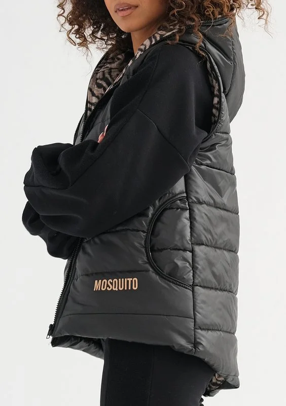 Czarny bezrękawnik damski to sekret wygody i czarującego stylu. To funkcjonalny, znakomicie skrojony model nieco dłuższy z tyłu, z praktycznym kapturem i kieszeniami. Nie przemaka, zachowuje ciepło i komfortową lekkość. Został efektownie ozdobiony logiem i motywem zebry.