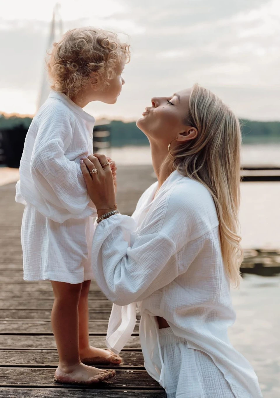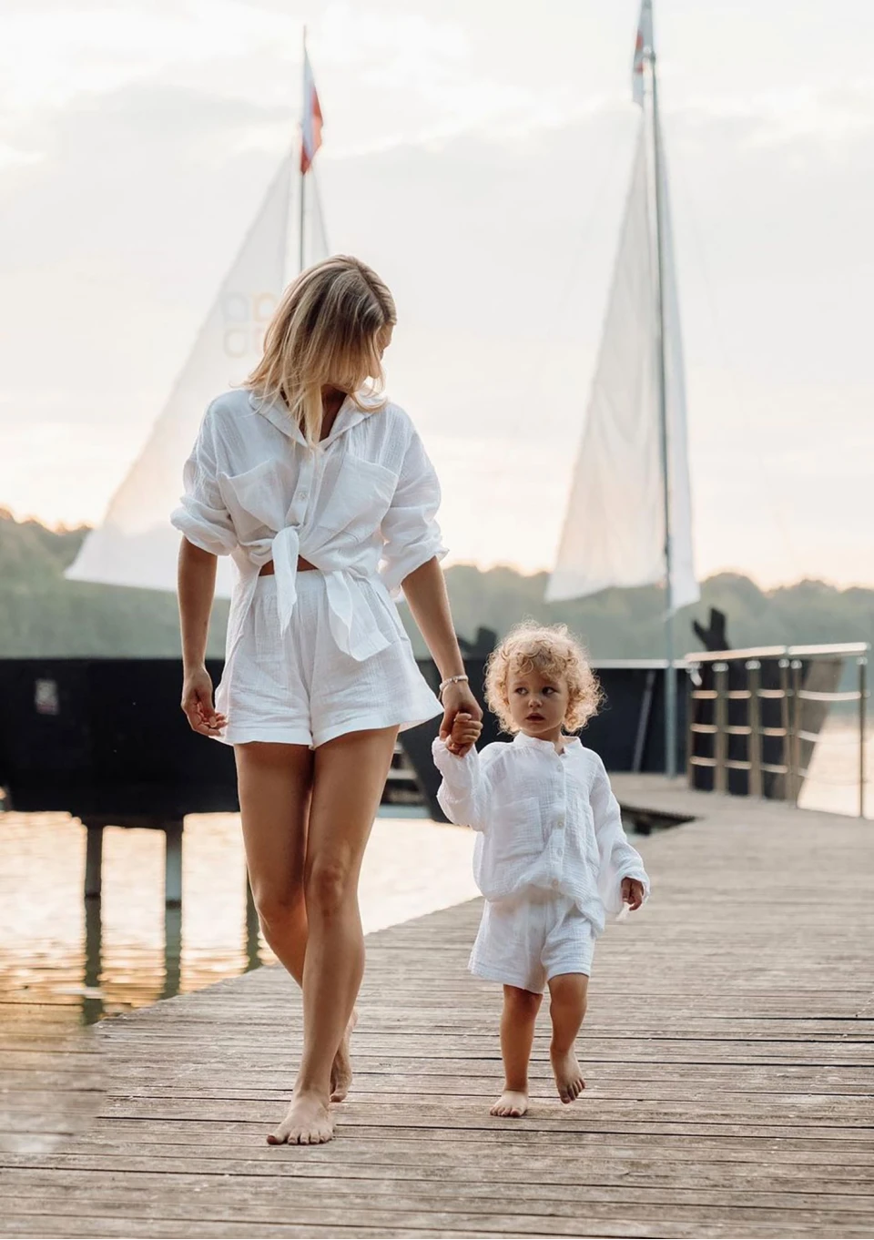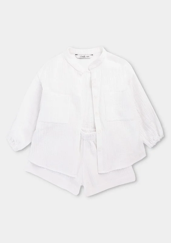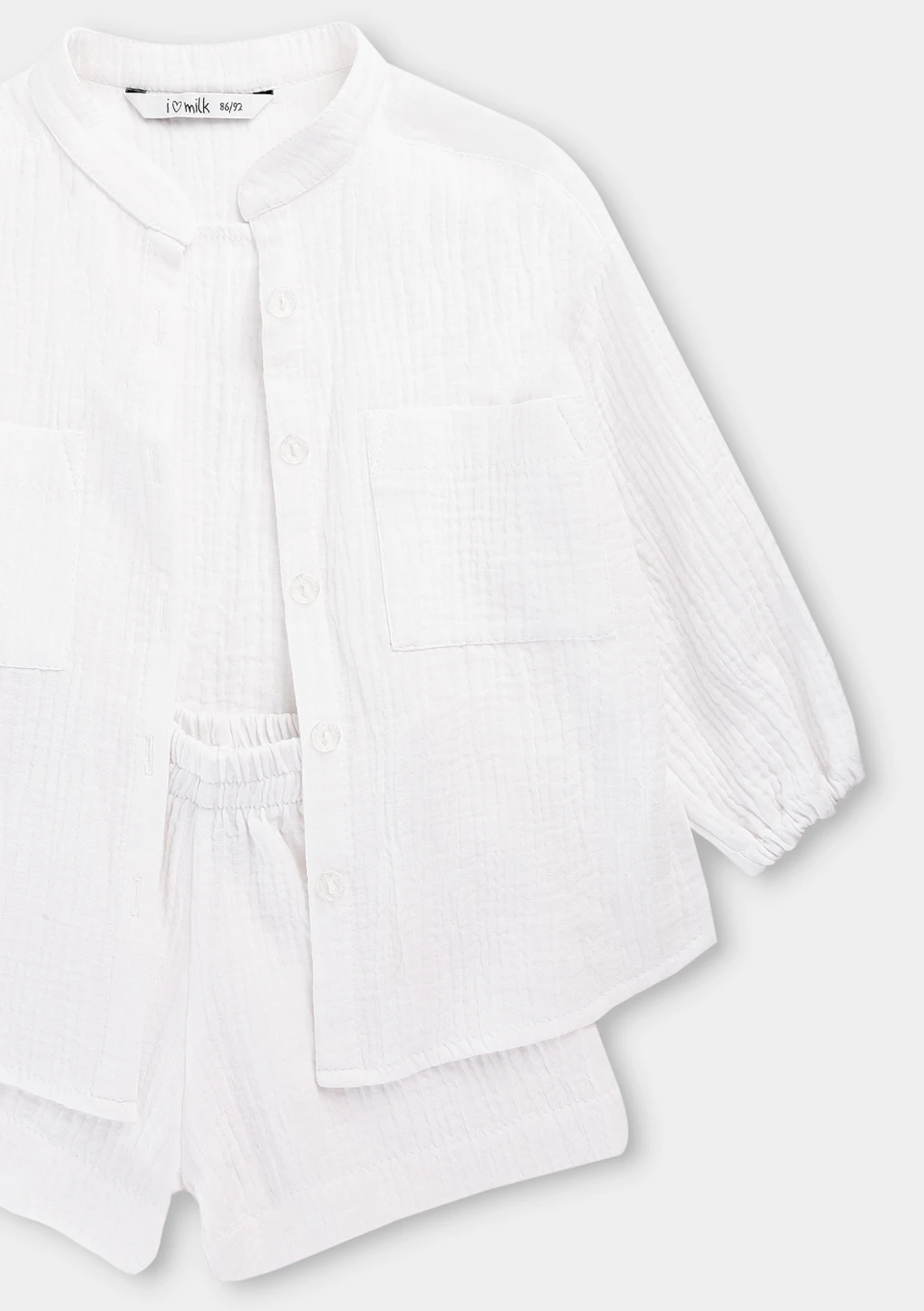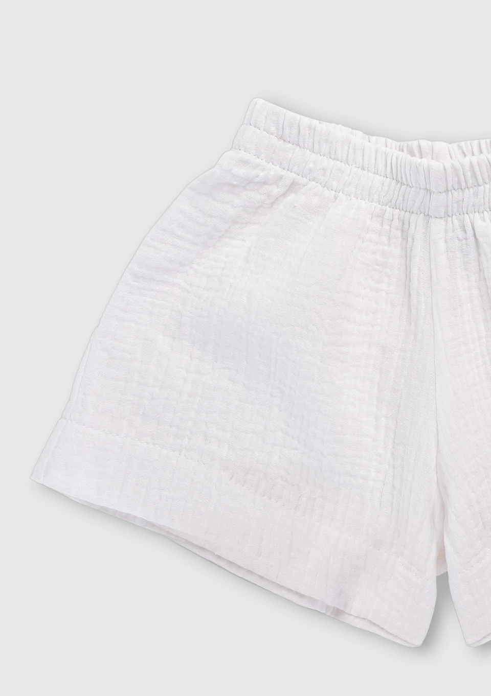 Białe szorty dziecięce z muślinu są najlepszym wyborem na upalne dni. Tkanina zawiera wyłącznie naturalną bawełnę.