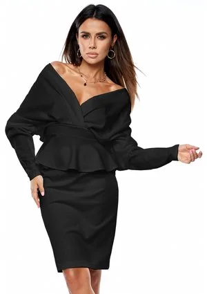Bluzka z baskinką na każdej kobiecie wygląda równie pięknie! Nie inaczej jest w przypadku prezentującej ją Natalii Siwiec. Wysokiej jakości tkanina poliestrowa o elastycznym wykończeniu sprawia, że bluzka świetnie układa się na ciele, podkreślając atuty sylwetki i maskując jej niedoskonałości. Kimonowy krój to gwarancja komfortu. Odważna wersja klasycznej bluzki tego typu typu śmiało odsłania ramiona. Odkryty dekolt jeszcze lepiej prezentuje się z łańcuszkiem i zawieszką. Kontrastem dla luźnych, szerokich rękawów jest przylegający, modelujący panel bluzki, który wraz z baskinką atrakcyjnie podkreśla talię. Czarna bluzka z matowym wykończeniem to ponadczasowy element stroju na wiele okazji. Sprawdzi się w stylizacjach formalnych i nie tylko. Można łączyć ją ze spódnicami ołówkowymi o dowolnej długości. Ciekawie kompletuje się też z niektórymi, dopasowanymi spodniami. Może stanowić element monochromatycznej stylizacji, lecz nada się do zestawień z kontrastowym, białym lub kolorowym dołem.