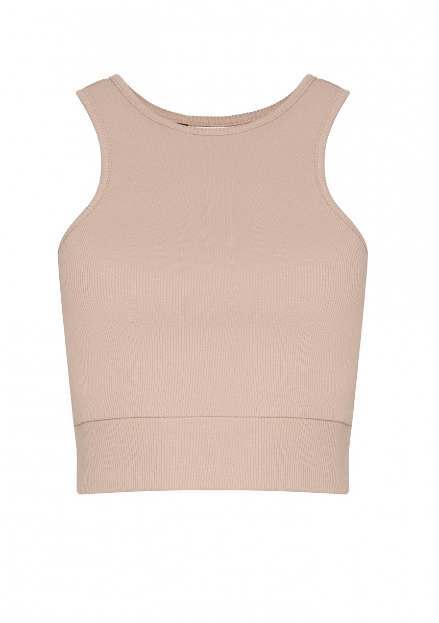 Prążkowany top damski z bawełny to baza do wielu zestawień. Do modelu możesz dopasować legginsy i bluzę w tym samym, beżowym kolorze.