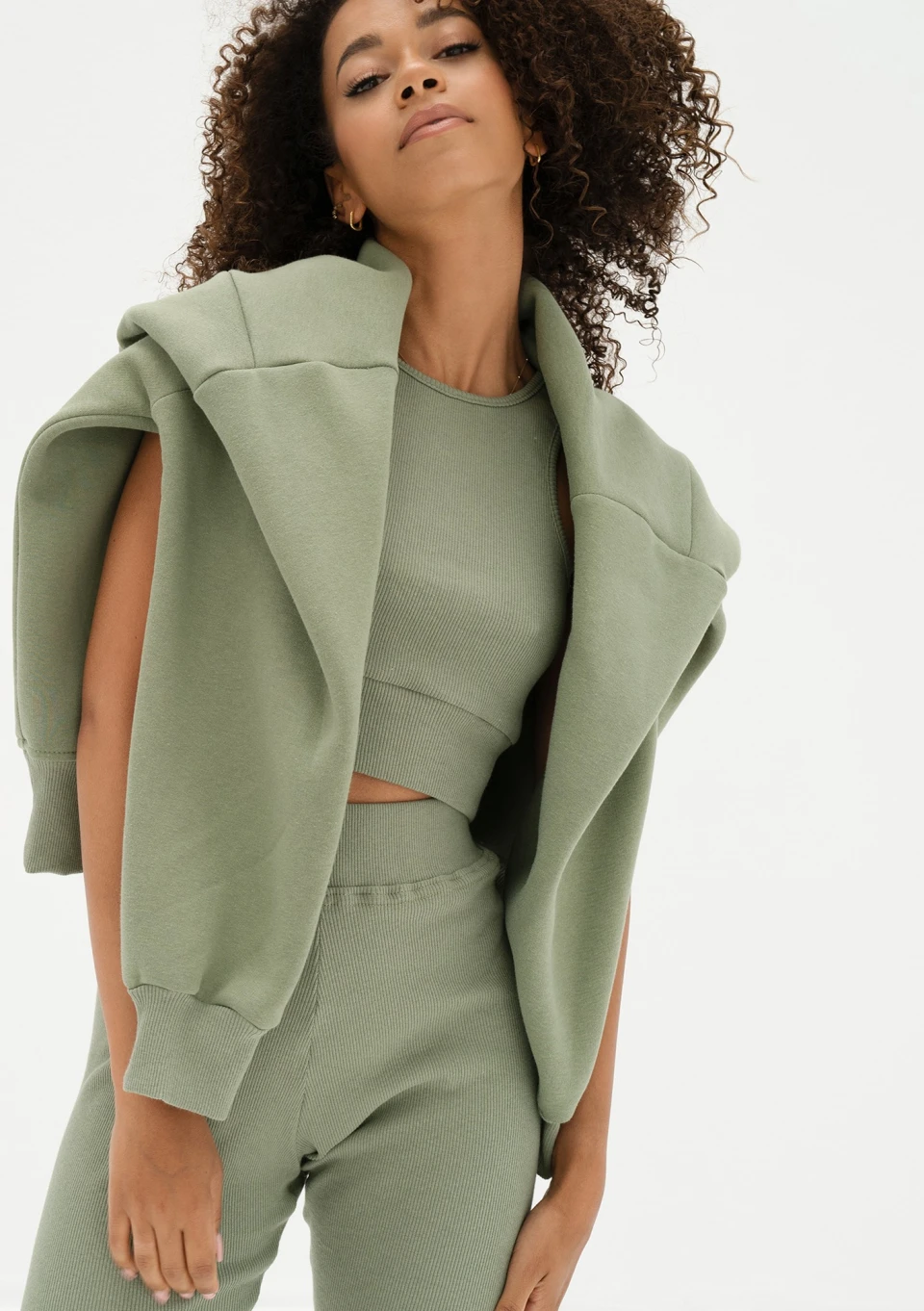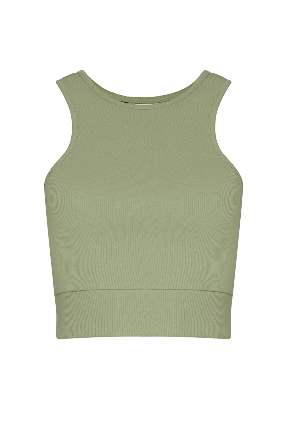 Prążkowany top damski z bawełny to baza do wielu zestawień. Do modelu możesz dopasować legginsy i bluzę w tym samym, oliwkowym odcieniu.