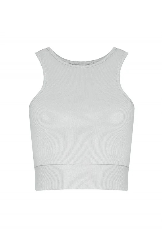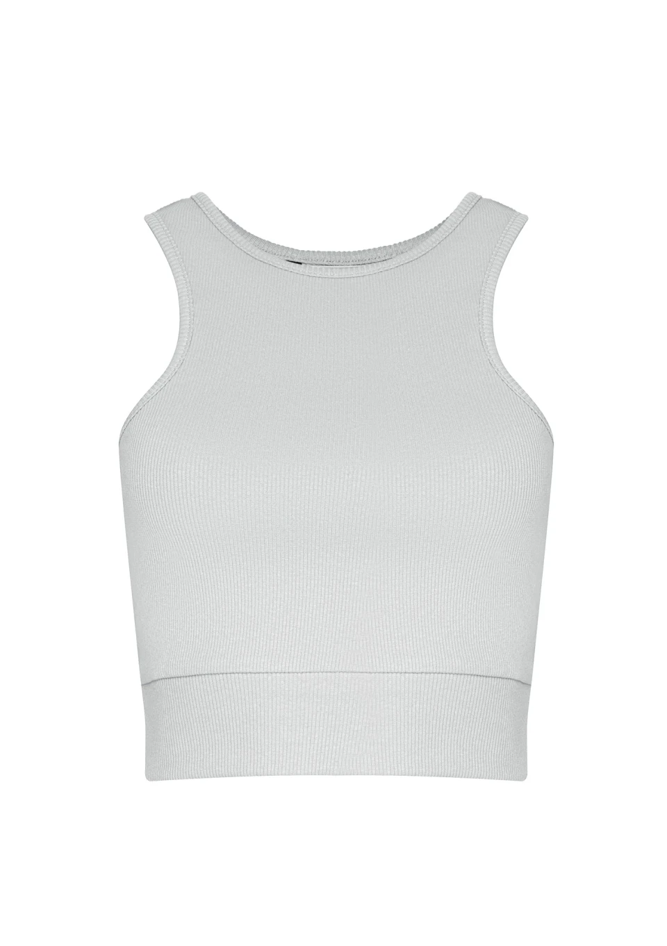 Dopasowany crop top damski z prążkowanej bawełny, uszyty w błękitnym odcieniu. Idealny basic do wielu kombinacji.
