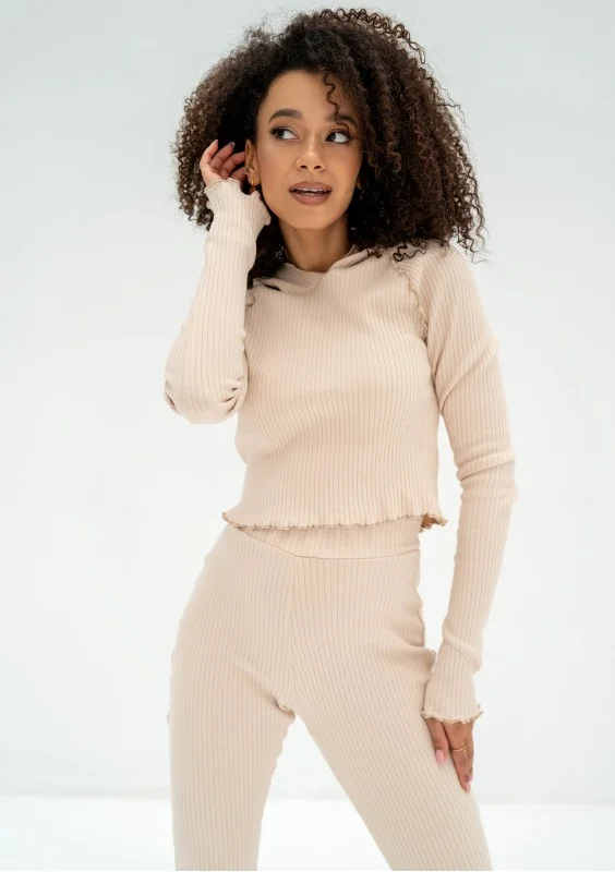 Clove - Bluzka crop z prążkowanej dzianiny z kapturem Beżowa