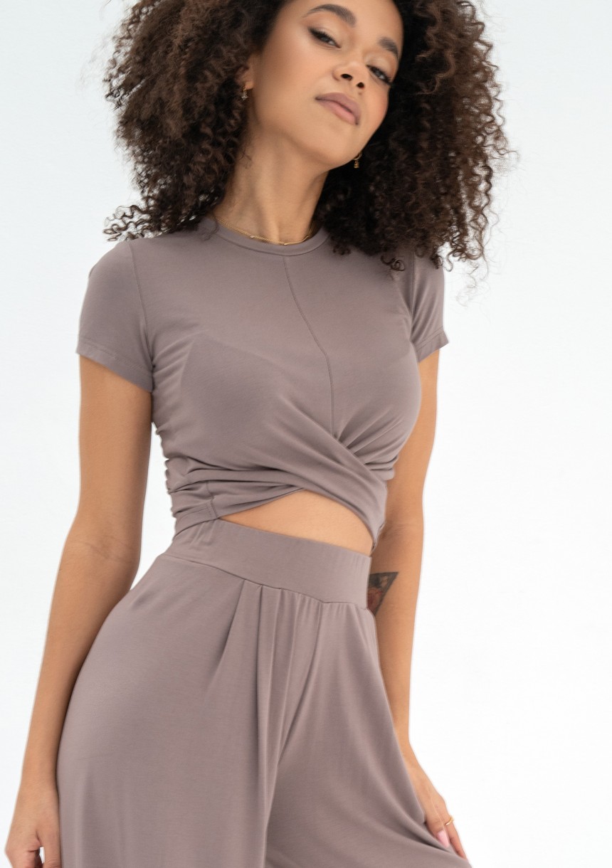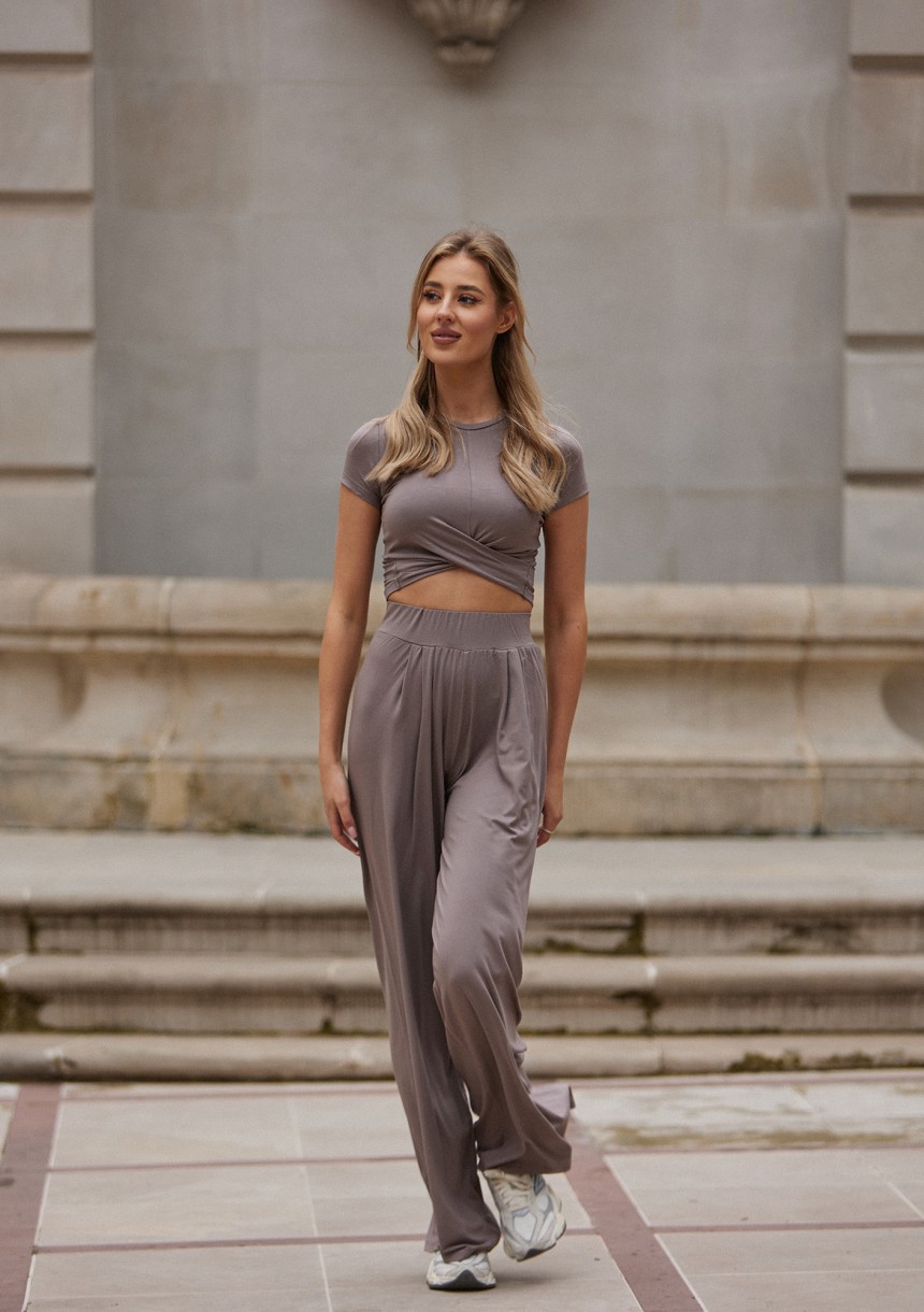 Beżowy top damski z krótkim rękawem to niezawodny, harmonijny element. Wykonany z miękkiej i przewiewnej tkaniny wiskozowej, jest nie tylko wygodny, ale również wyjątkowo elegancki. Jego dopasowany krój, sięgający talii, podkreśla kobiecą sylwetkę, a materiał, który krzyżuje się na przodzie, dodaje mu unikalnego uroku. Może być noszony samodzielnie lub zestawiony z dedykowanymi spodniami, tworząc elegancki komplet, który idealnie pasuje zarówno do pracy w letnie upalne dni, jak i na spotkania ze znajomymi.