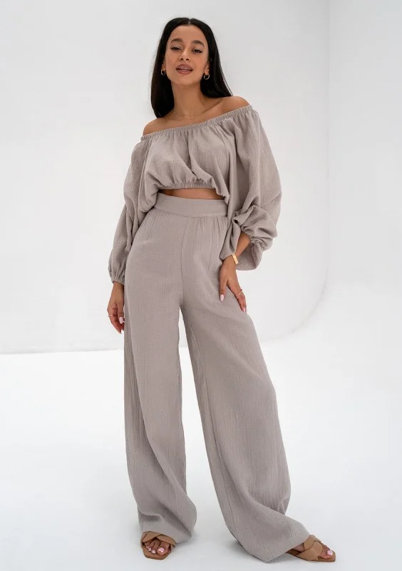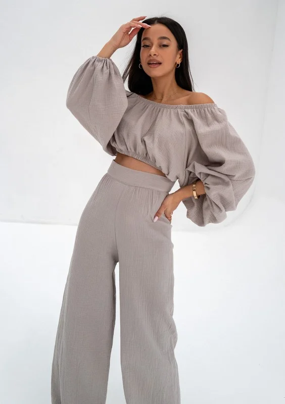 Letnia bluzka damska w hiszpańskim stylu, wykonana z naturalnej i przewiewnej tkaniny muślinowej. Top w neutralnym kolorze taupe.