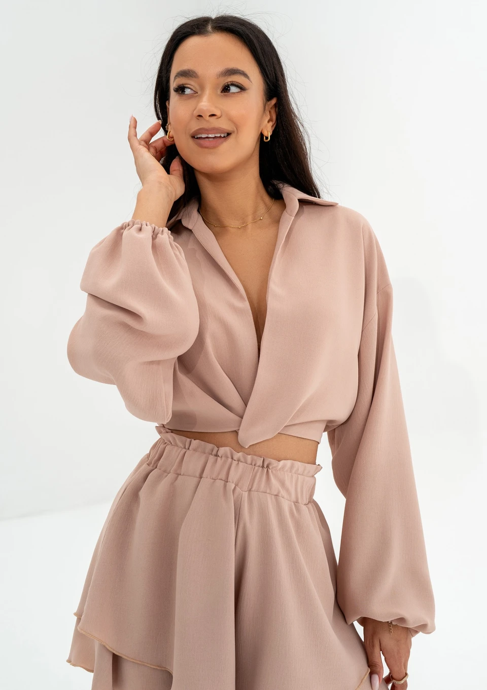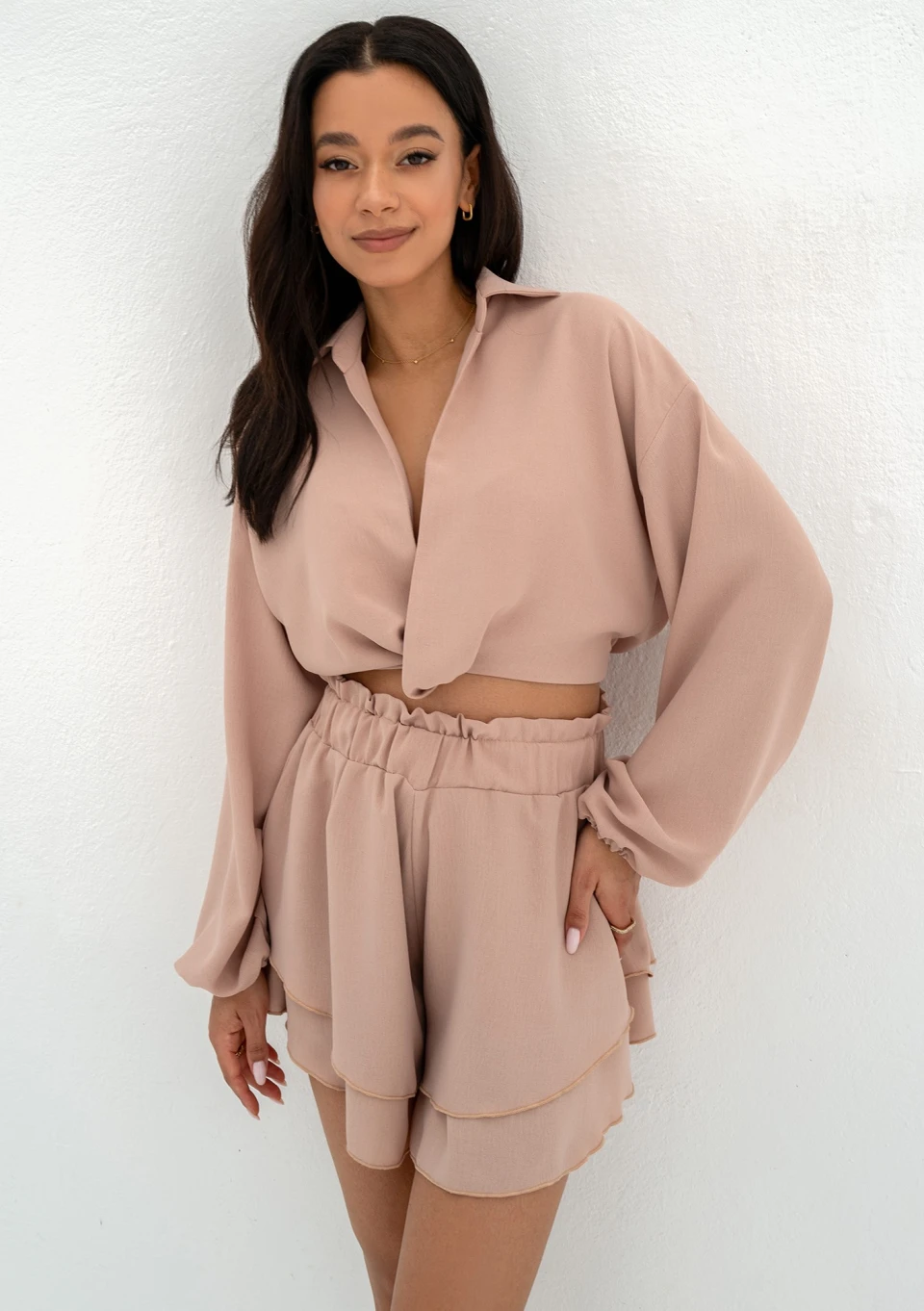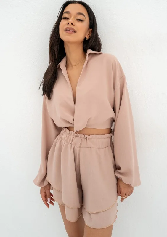 Beżowa koszula damska o stylowym, krótkim kroju. Wykonana ze zwiewnej tkaniny. Może być elementem letniego kompletu z rozkloszowanymi szortami.