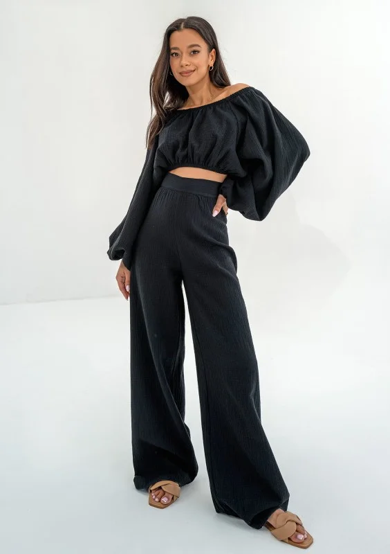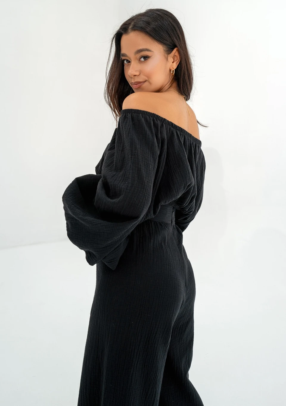Czarna bluzka damska o krótkim kroju z dekoltem w łódkę i luźnym rękawem. Top w hiszpańskim stylu, uszyty ze zwiewnego muślinu.