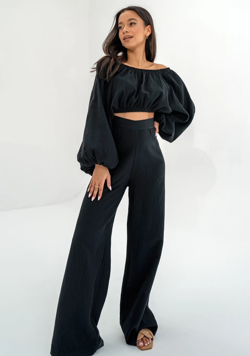 Czarna bluzka z dekoltem w łódkę w hiszpańskim stylu to idealny element garderoby na lato. Możesz ją zakupić w zestawie z szortami lub długimi, szerokimi spodniami z muślinu. Taki komplet zapewnia nie tylko wygodę i lekkość, ale także świetnie cyrkuluje powietrze, co jest niezwykle istotne podczas gorących dni. Klasyczny hiszpański styl dodaje także nutę elegancji i romantyzmu, co czyni ten zestaw odpowiednim zarówno na plażę, jak i na wieczorne wyjścia.