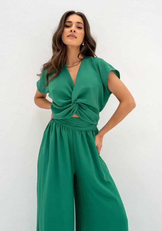 Zielony top damski ze zwiewnej tkaniny. Model o krótkim kroju, eksponuje talię. Elegancko dopełniony draperią.