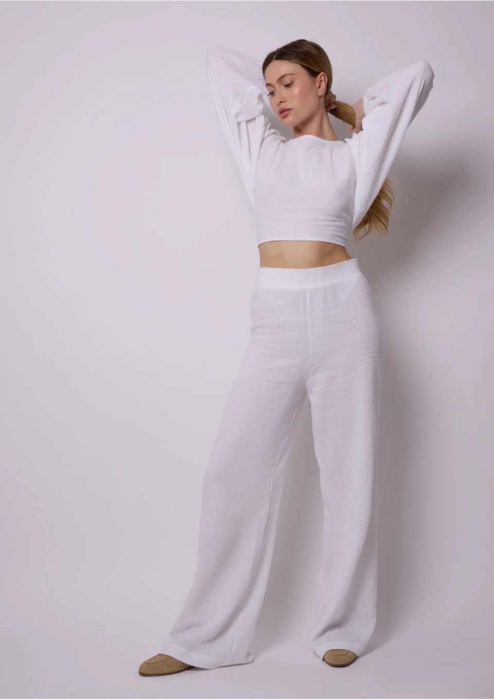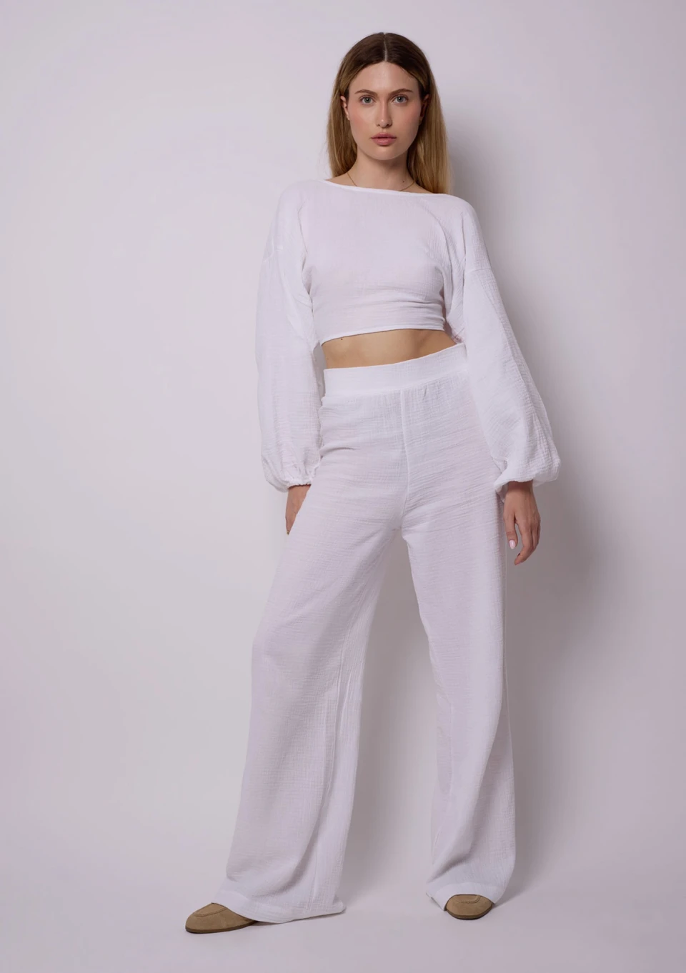 Zwiewny top muślinowy z długim rękawem w białym kolorze. Model o krótkim kroju, finezyjnie wiązany z na plecach.