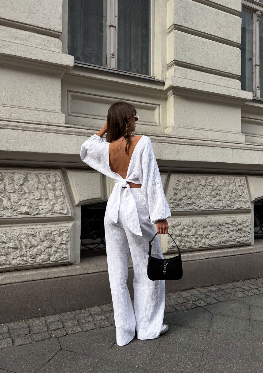 Zwiewny top muślinowy z długim rękawem w białym kolorze. Model o krótkim kroju, finezyjnie wiązany z na plecach.