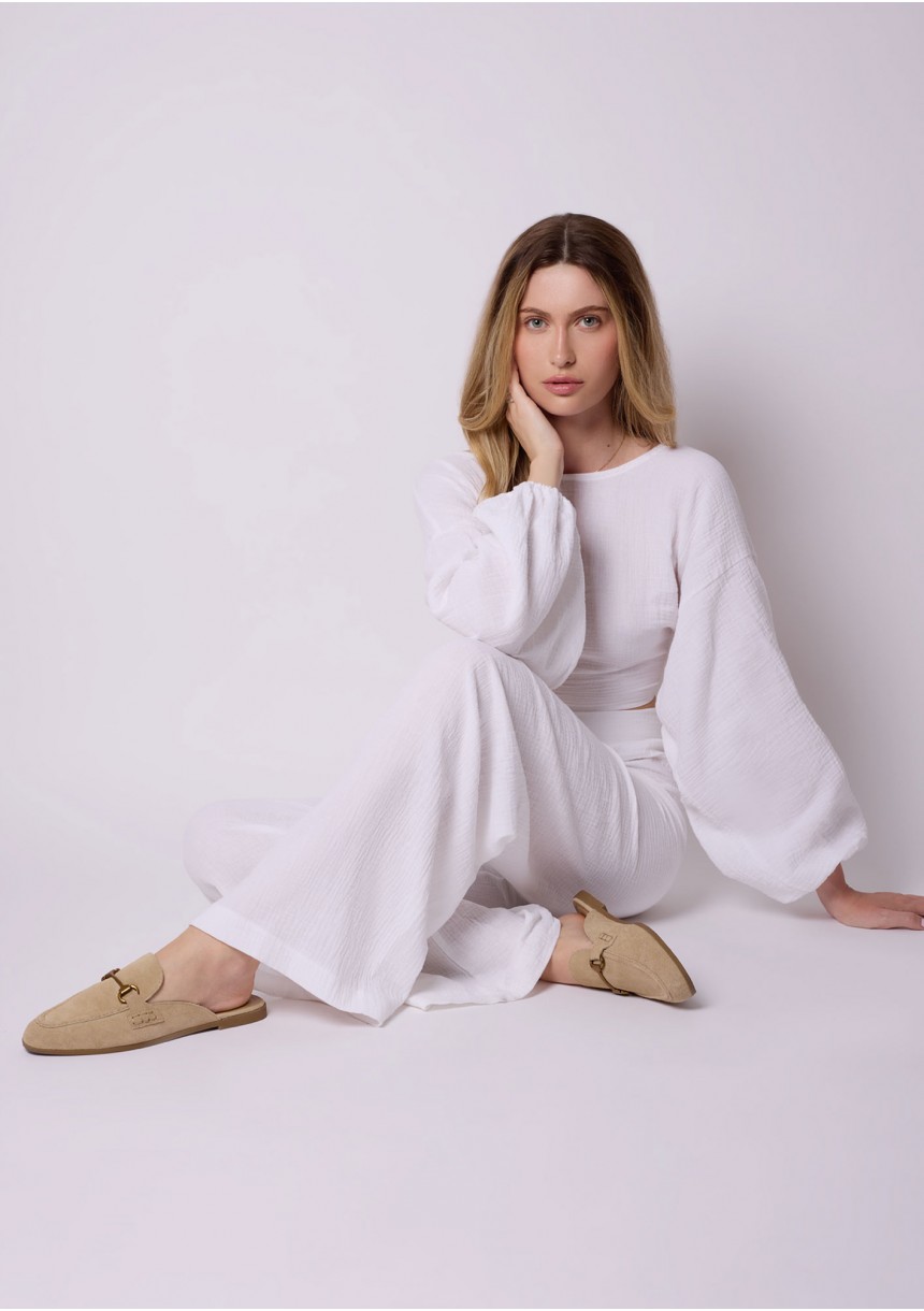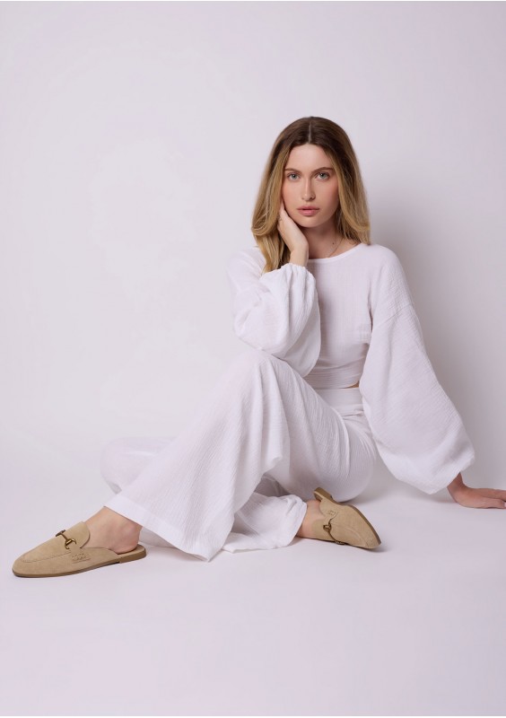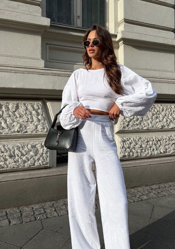 Kompletując letnią garderobę przede wszystkim uzupełnij ją o delikatne ubrania z muślinu, które zapewnią komfortową lekkość i przewiew w najgorętsze dni. Na upalną pogodę w rozgrzanym mieście lub podczas wakacji sprawdzi się efektowny top o krótkim kroju z luźnym rękawem, który zasłoni ramiona przed nadmiernym słońcem. Luźny fason wykonaliśmy w neutralnej, białej barwie, która zapewni Ci estetyczny i subtelny styl oraz świetną bazę do różnokolorowych dodatków.