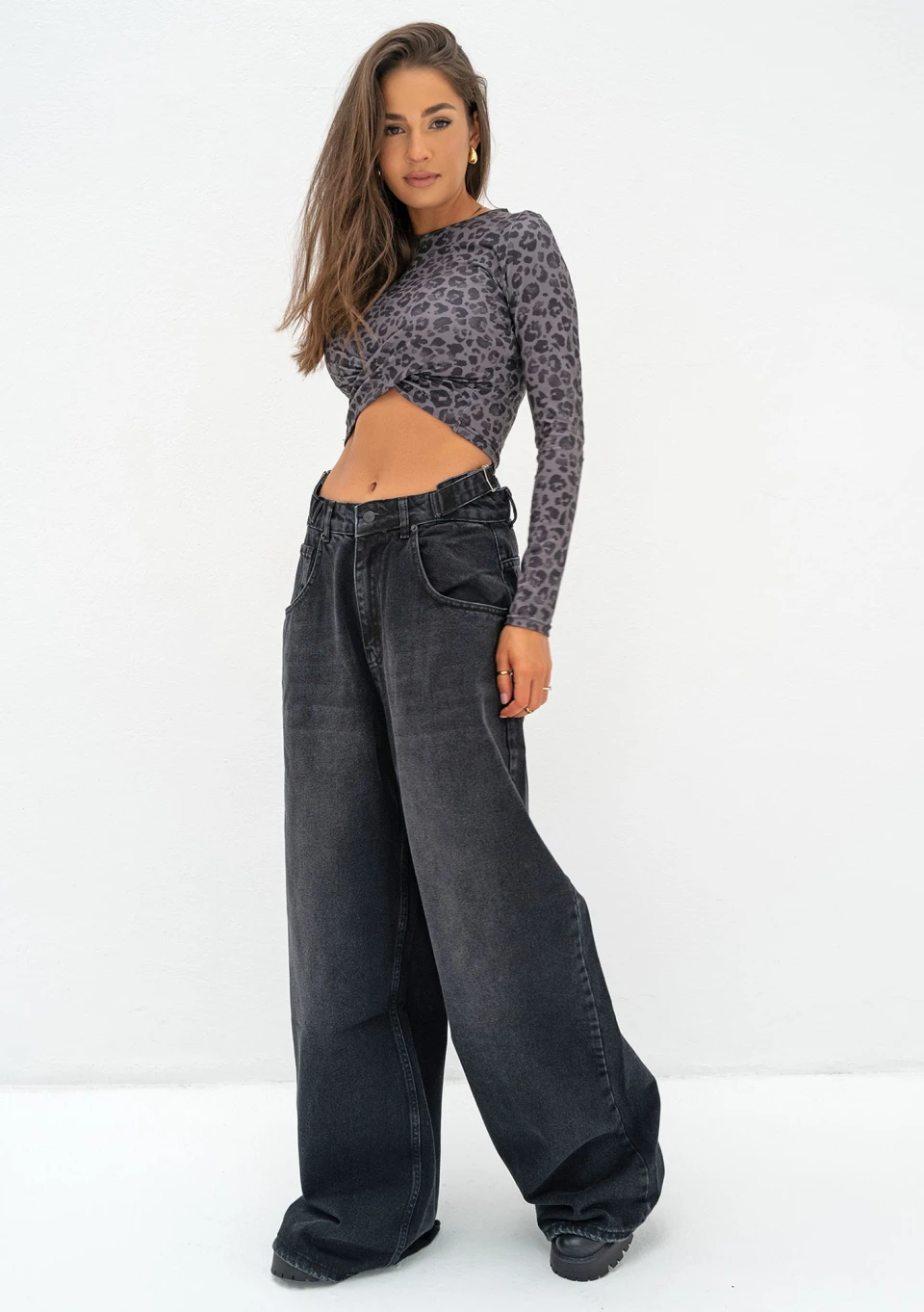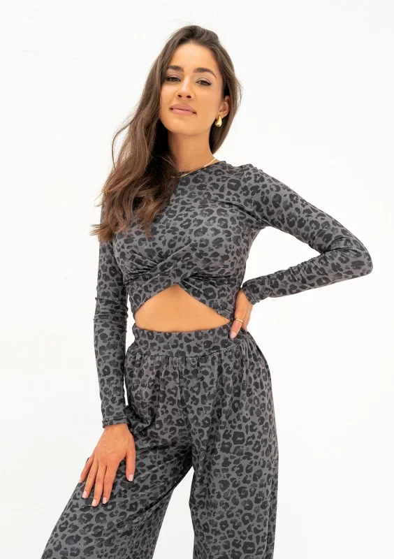 Efektowny top damski o dopasowanej formule. Wykonany z elastycznego materiału w szarą panterkę. Przepiękna draperia i krótki krój przyciąga uwagę do talii.