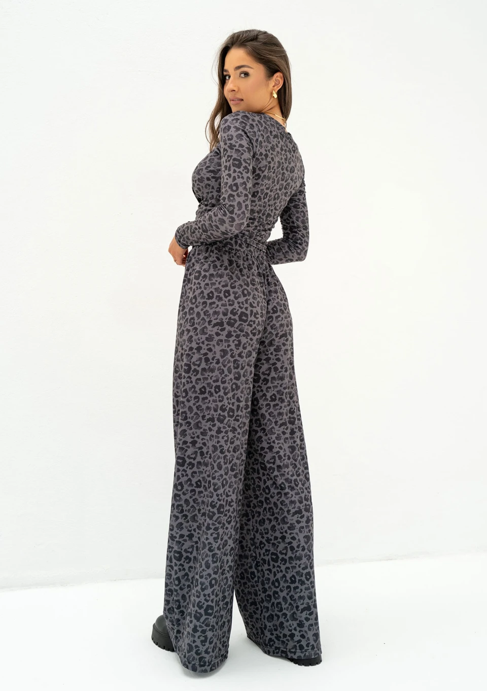 Top damski w panterkę ze skrzyżowaną draperią pięknie eksponuje talię. Fason świetnie prezentuje się zarówno w komplecie ze spodniami Goty, jak i innymi, dowolnymi z wysokim stanem. Materiał jest wygodnie elastyczny, doskonale dopasowuje się do sylwetki.