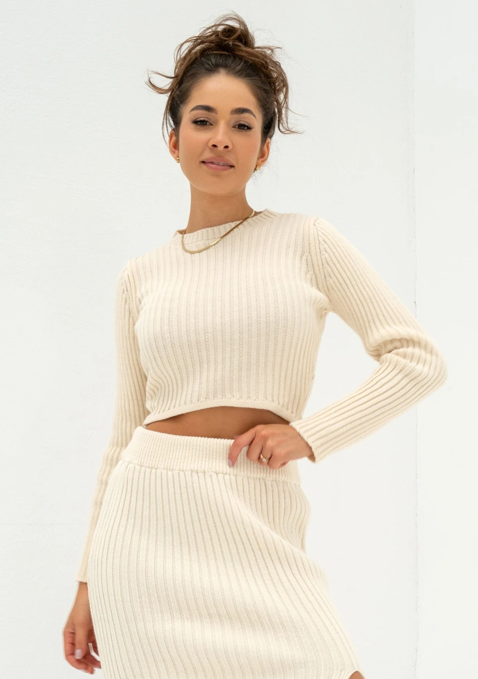 Bluzka damska o krótkim kroju, wykonana z cienkim splotem w prążki z miękkiej dzianiny. Wszechstronny top w kolorze beżowym.