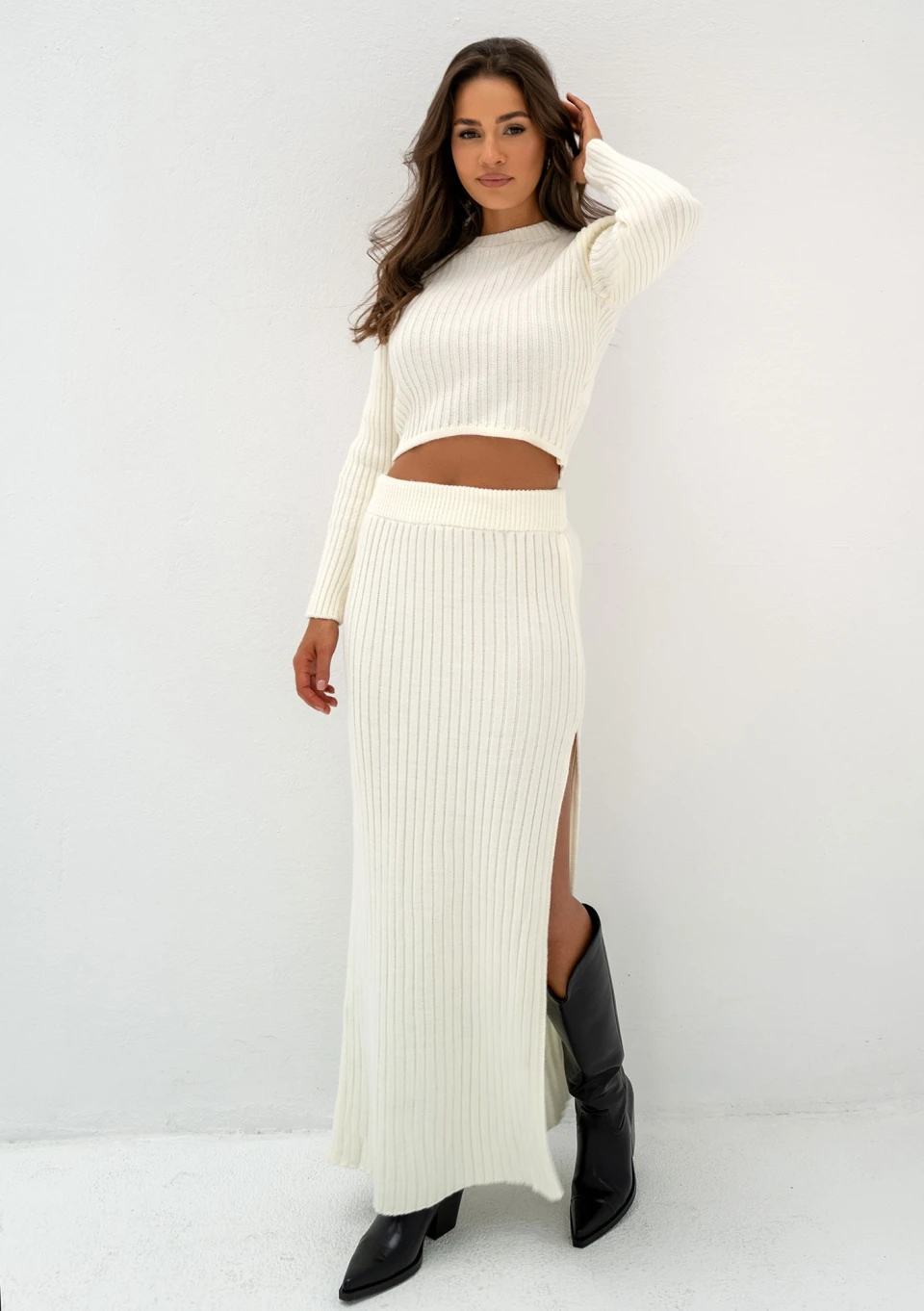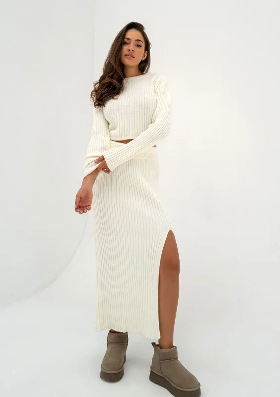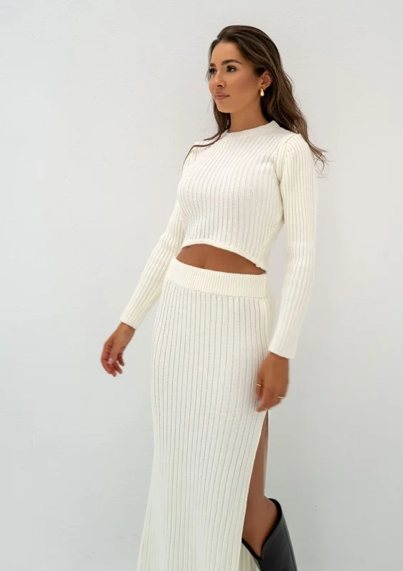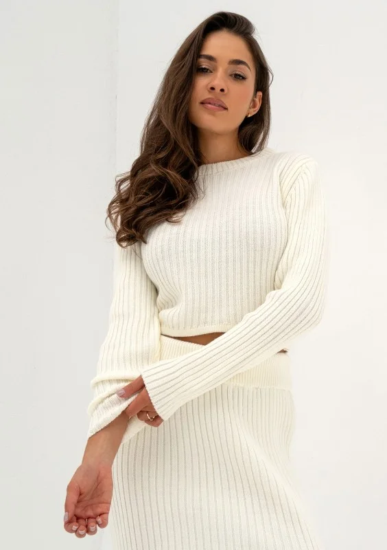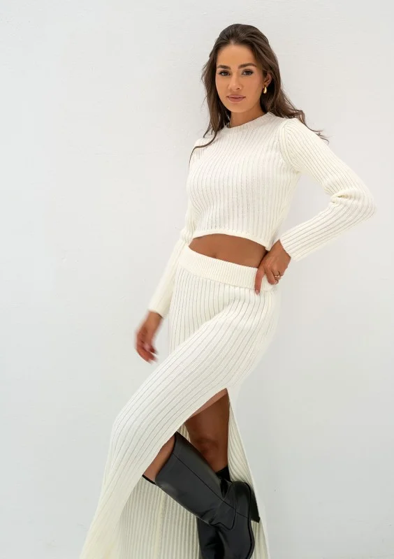 Pełna subtelności bluzka damska dzianinowa w eleganckim odcieniu ecru. Wykonana z delikatnej, ciepłej włóczki akrylowej. Model o krótkim kroju, świetnie dopasowanym do dedykowanej spódnicy Kirry. Postaw na gotowy zestaw, dzięki któremu szybko ubierzesz się na zajęcia czy do pracy. Wygodny, ciepły look idealnie sprawdzi się w jesienno-zimowym sezonie, w którym królują zmysłowe, dzianinowe komplety damskie.