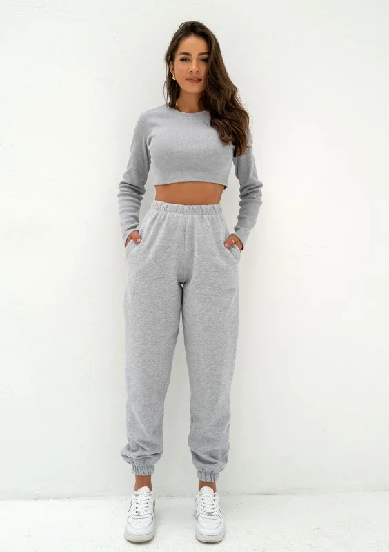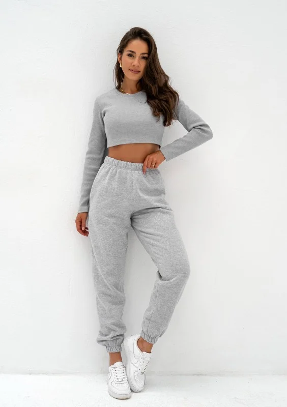 Szary top damski o krótkim kroju to modny i wszechstronny basic. Dzięki wykonaniu z prążkowanej bawełny zarówno prezentuje się naturalnie, jak i dopasowuje do sylwetki, podkreślając kształty. Materiał jest wygodny, naturalny, oddychający. Bluzka rewelacyjnie uzupełni wszelkie fasony, modne oversizowe spodnie dresowe, dresy, a nawet eleganckie spódnice. Deseń materiału jest delikatnie melanżowy, top zatem w pełni koresponduje z naszymi kompletami dresowymi o kolorze Grey Melange.