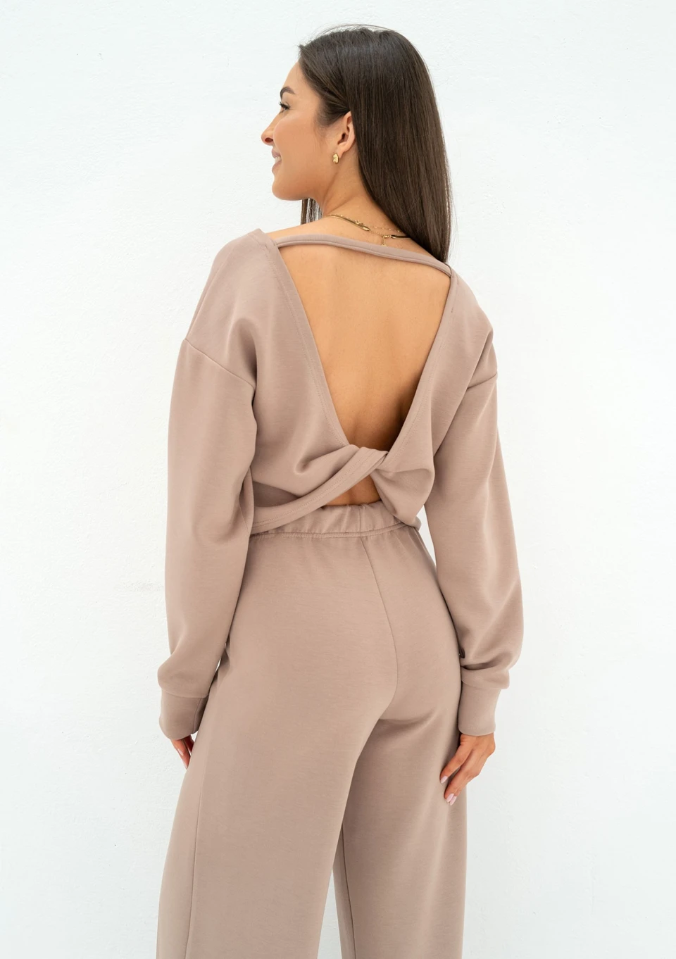 Stylowa bluza w odcieniu latte. Z przodu klasyczna, z tyłu zaskakuje niebanalnym designem z odkrytymi plecami. Wykonana z dodatkiem wiskozy.
