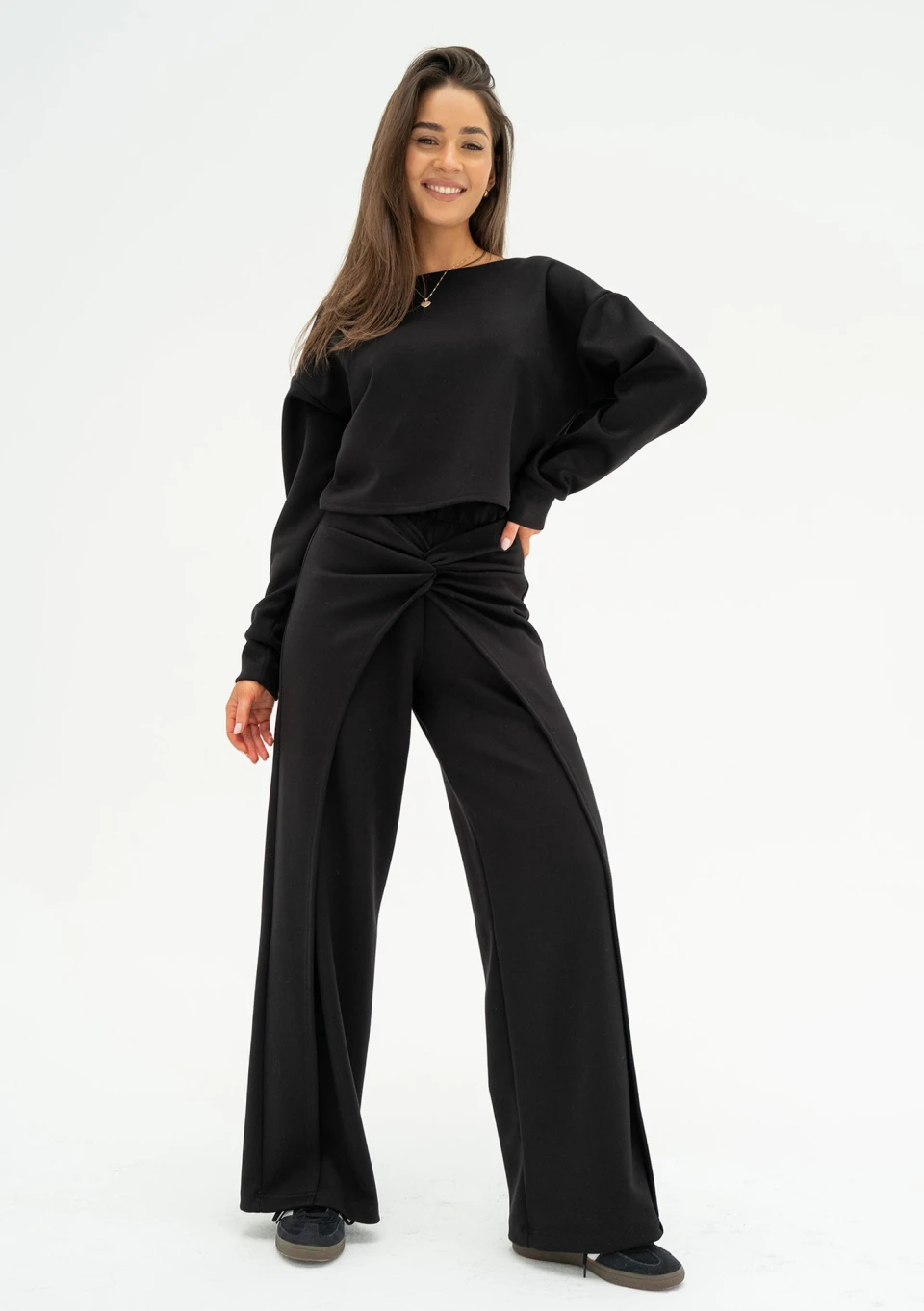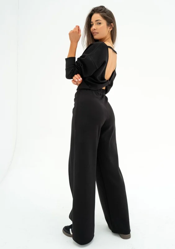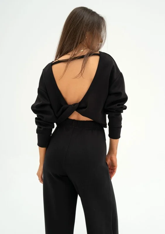 Czarna bluza z przodu prezentuje się jak klasyczny model, z tyłu zaskakuje i intryguje. Niebanalny design skupia się na niezwykłym detalu: odkrytych plecach.
