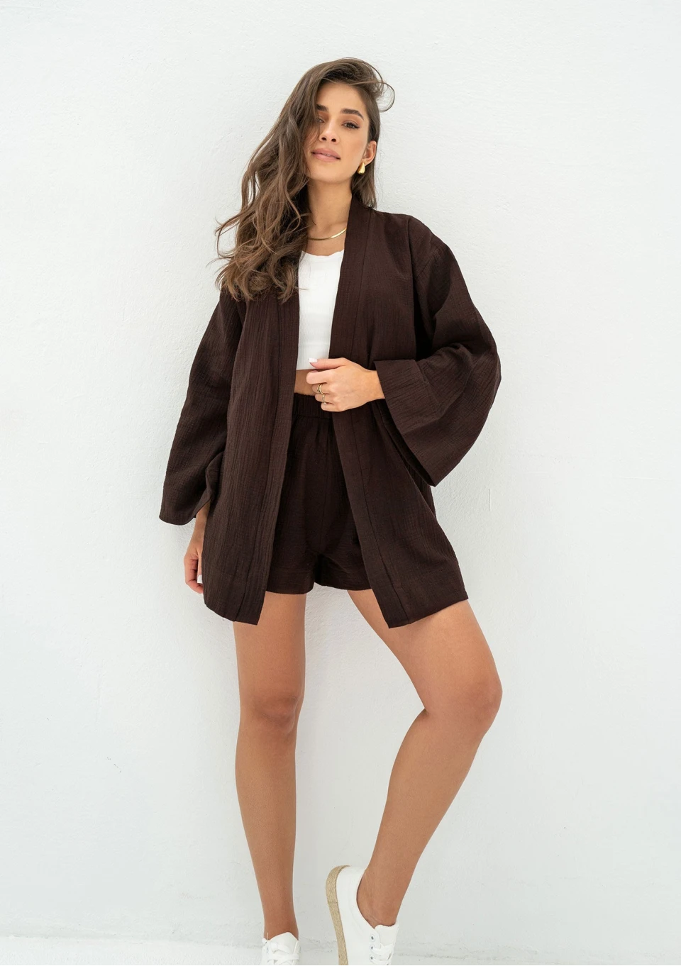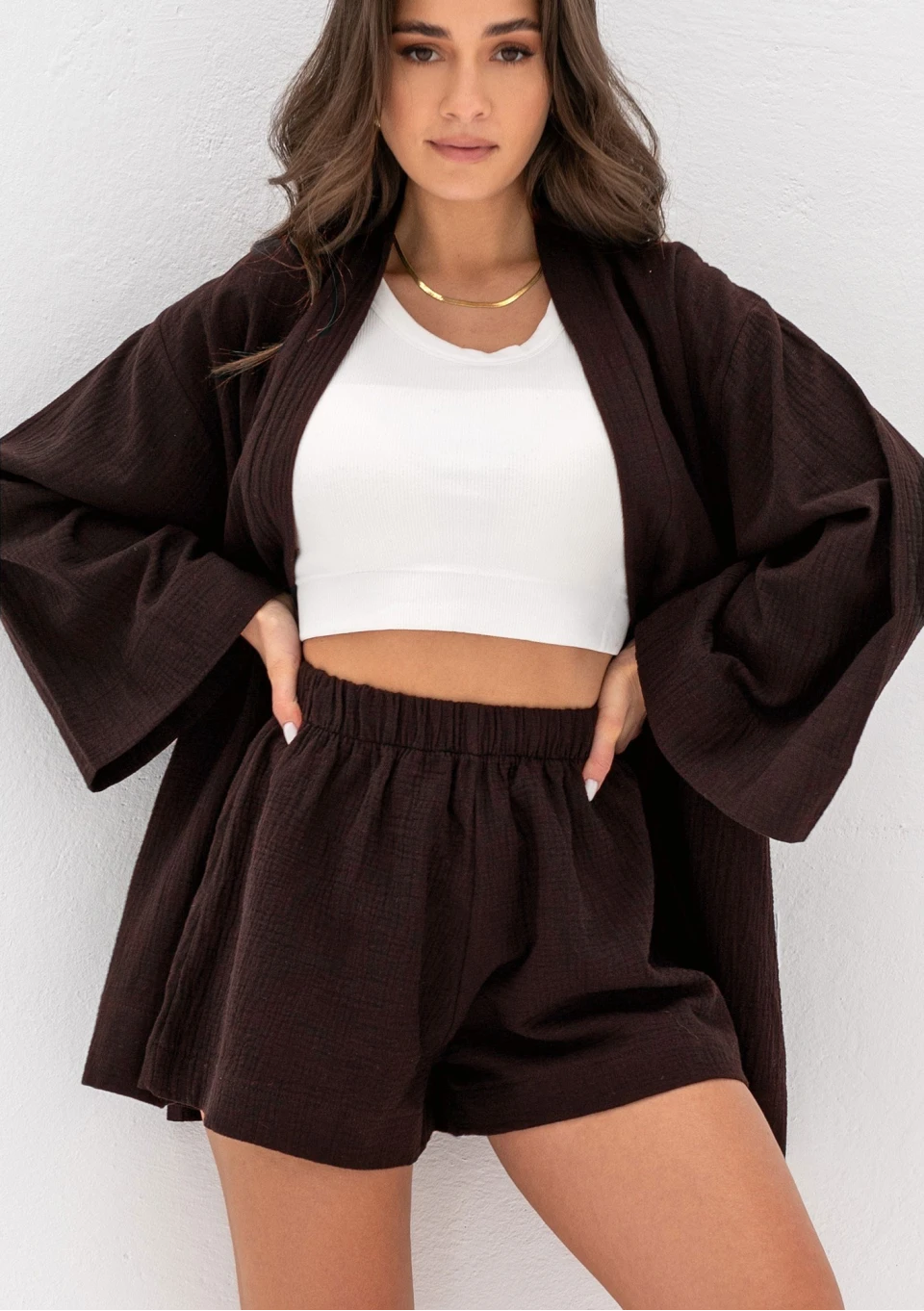 Powiększamy kolekcję naszych letnich ubrań damskich z muślinu o nową kolorystykę! Tego lata proponujemy stylową narzutkę Pavla w ciemnym, brązowym odcieniu. To w pełni luźny fason, który możesz skomponować z różnymi krojami szortów, spodni i spódnic z muślinu w tym samym kolorze. Sprawdź koniecznie zakładkę z muślinowymi kompletami letnimi, znajdziesz tam wszystko, co przygotowaliśmy z tego materiału. W produkcji korzystamy z muślinu wysokiej jakości oraz bardzo staramy się, by nasze ubrania były nie tylko stylowe, ale i porządnie wykonane. Spośród bogatej oferty z pewnością wybierzesz idealny look dla siebie. Latem, gdy słońce przygrzeje w pełni, będziesz zachwycona jak lekko i wygodnie jest w naszych muślinowych stylizacjach.