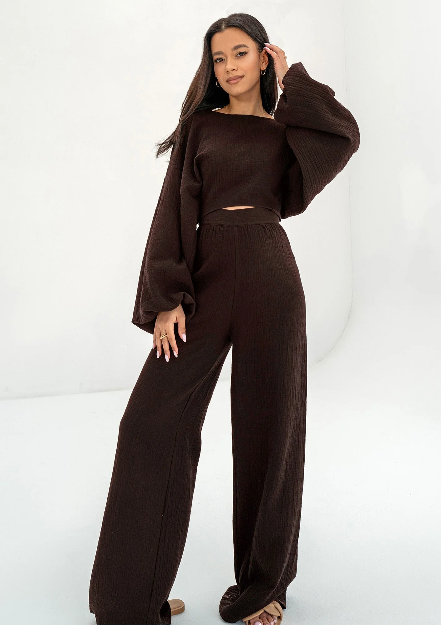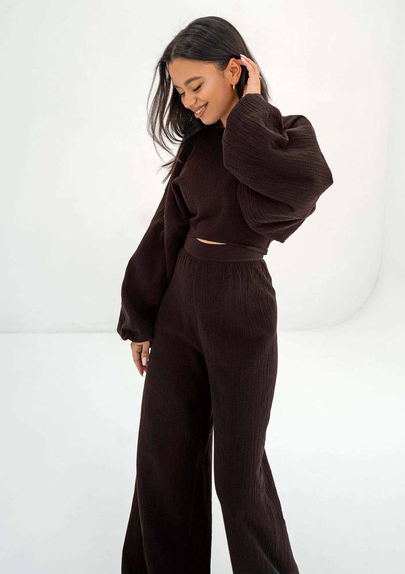 Kompletując letnią garderobę przede wszystkim uzupełnij ją o delikatne ubrania z muślinu, które zapewnią komfortową lekkość i przewiew w najgorętsze dni. Na upalną pogodę w rozgrzanym mieście lub podczas wakacji sprawdzi się efektowny, muślinowy top damski o krótkim kroju z luźnym rękawem, który zasłoni ramiona przed nadmiernym słońcem. Luźny fason wykonaliśmy w neutralnej, czekoladowej barwie, która zapewni Ci estetyczny i subtelny styl oraz świetną bazę do różnokolorowych dodatków.