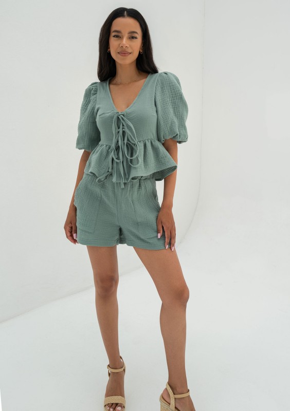 Miętowa bluzka o eterycznym kroju ze zwiewną baskinką. Wykonana z naturalnego muślinu, jest delikatna i bardzo komfortowa.