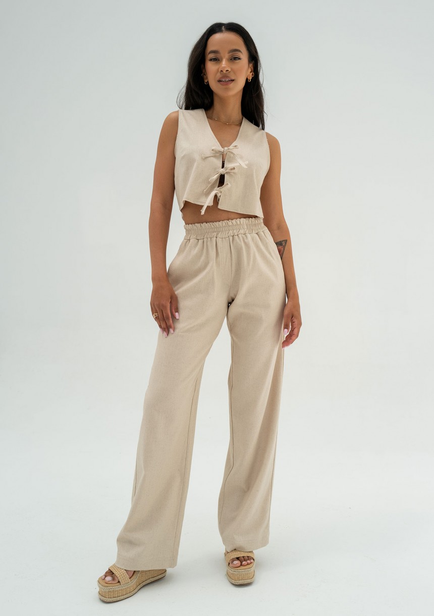 Stylowa kamizelka ze szlachetnej tkaniny lnianej o krótkim kroju, wiązana. Dzięki niej stworzysz wyjątkowy, letni look.