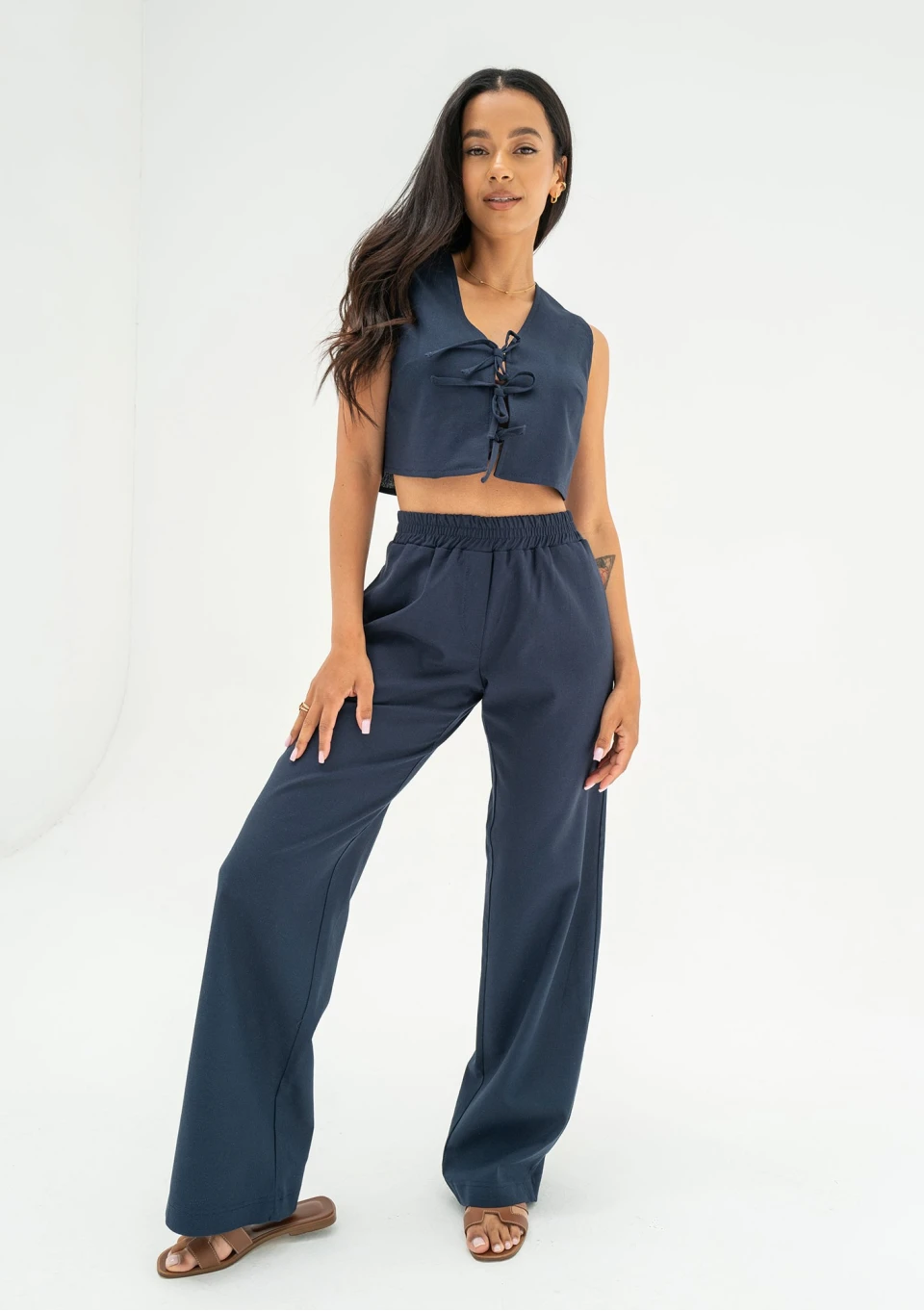 Granatowa kamizelka ze szlachetnej tkaniny lnianej o krótkim kroju z wiązaniami. Dzięki niej stworzysz wyjątkową, letnią stylizację.