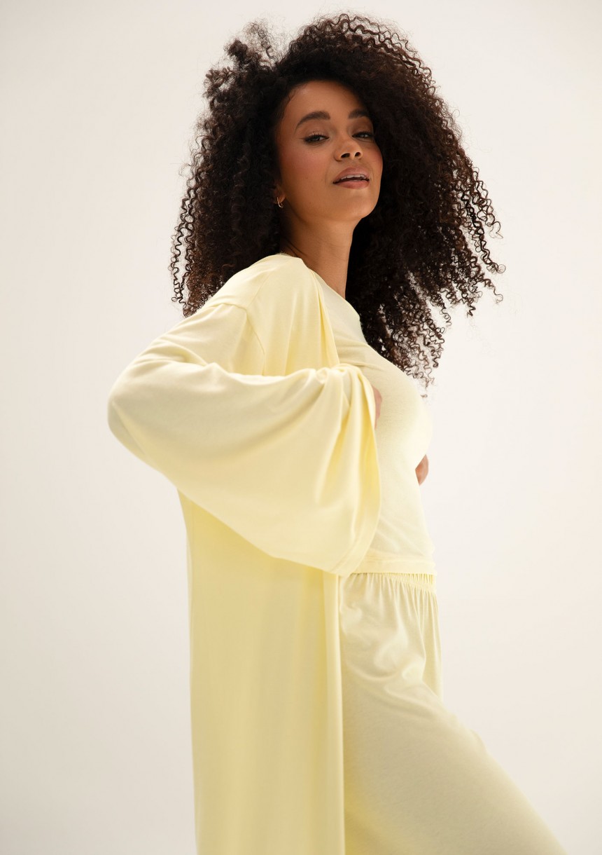 Zwiewna narzutka-kimono maxi, wykonana z tkaniny wiskozowej w maślanym kolorze. Doskonałe zwieńczenie stylizacji na letnie wieczory.