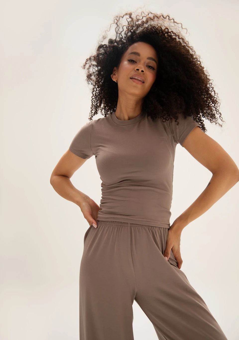 Brązowa koszulka o dopasowanym kroju to doskonała baza do tworzenia niezliczonych, letnich stylizacji. Wykonana z wiskozy, idealna na ciepłe dni.