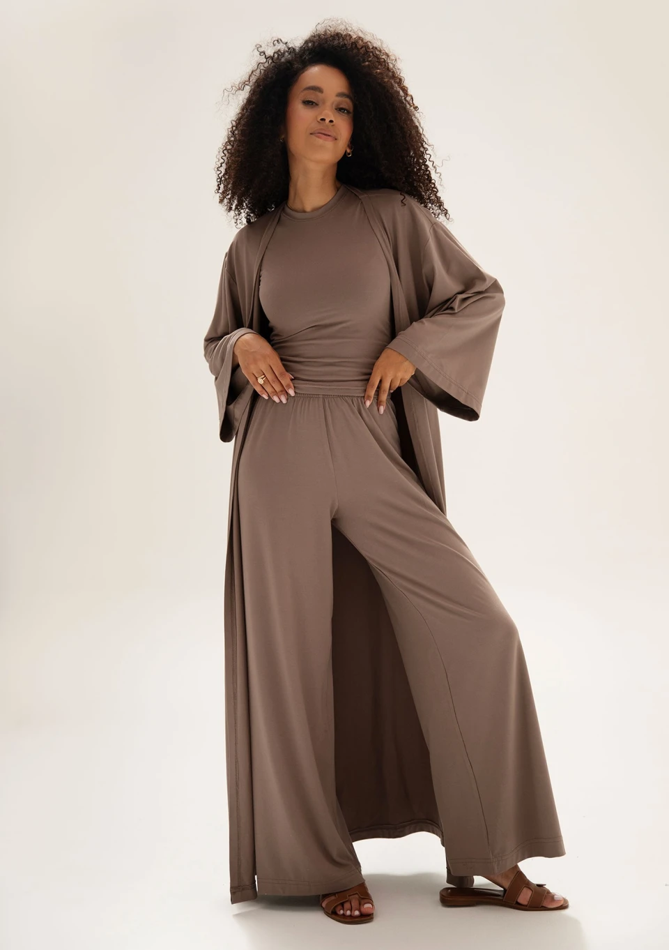Zestaw składający się z długiego kimona/narzutki, topu z krótkim rękawem i szerokich spodni jest bardzo uniwersalny. Może służyć jako wygodny strój do relaksu, spacer, stylizacja na codzienne wyjścia i wakacje. Lekka tkanina wiskozowa doskonale sprawdza się w ciepłe dni, gwarantując wrażenie chłodu i pełny przewiew. Stylowym kimonem możesz otulić ramiona wieczorową porą i w poczuciu pełnej wygody i lekkości podziwiać letnie zachody słońca!