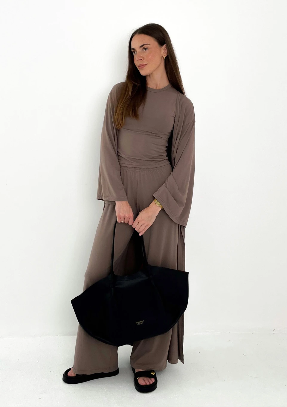 Lekka narzutka-kimono maxi, wykonana ze zwiewnej tkaniny wiskozowej w odcieniu latte. Doskonałe zwieńczenie letnich stylizacji!