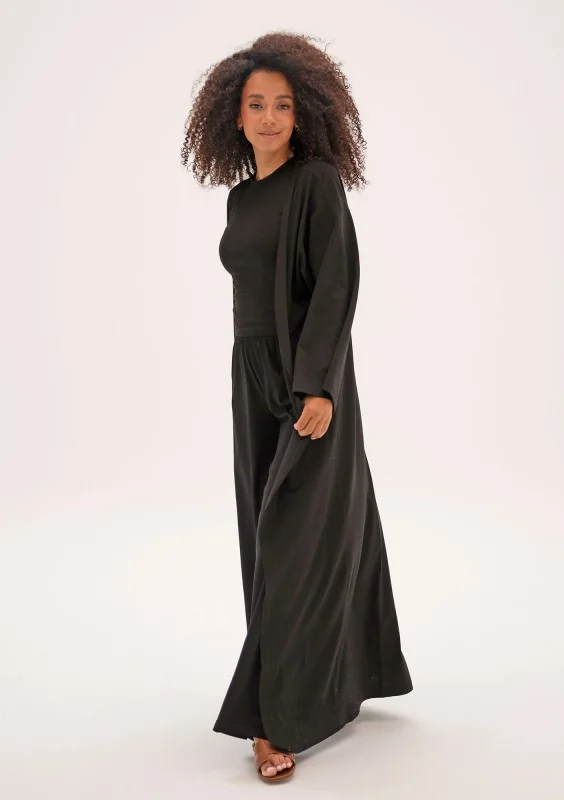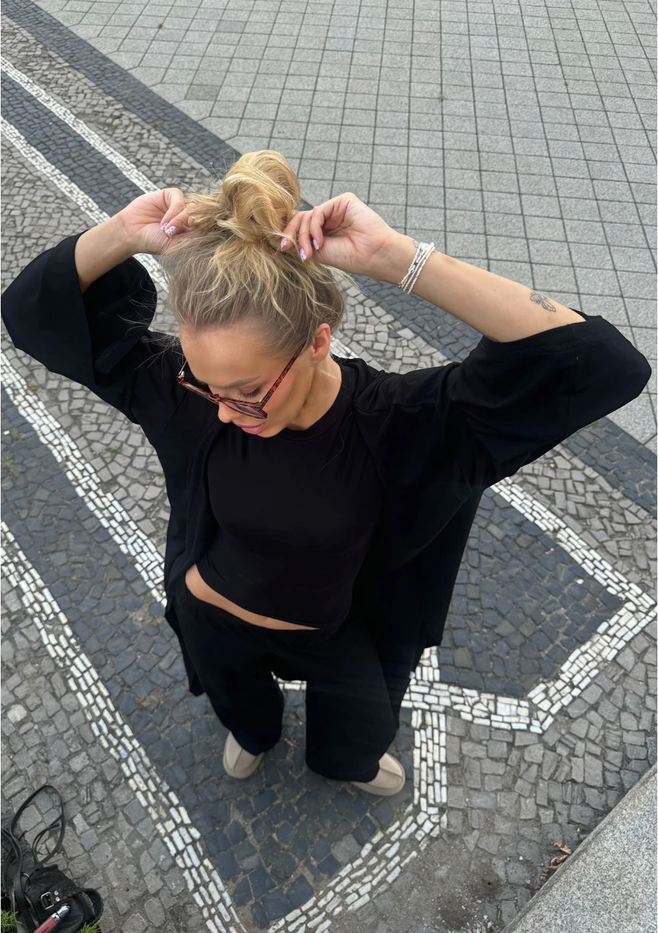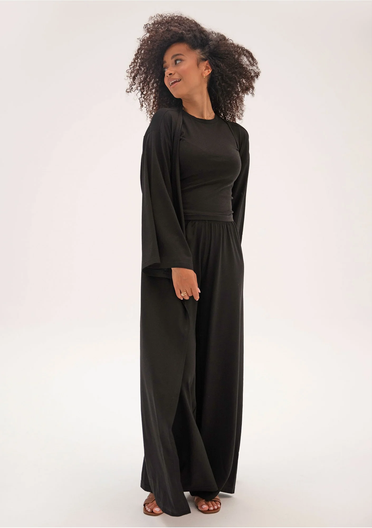 Dzięki lekkiej wiskozie, czarne kimono maxi idealnie nadaje się na ciepłe dni, zapewniając uczucie chłodu i doskonałą wentylację. Długa narzutka to także świetne rozwiązanie na wieczorne ochłodzenia, pozwalając cieszyć się letnimi zachodami słońca w poczuciu pełnej swobody i lekkości. Zbuduj elegancki look ze wszystkich trzech fasonów Lumiere: kimona, topu i zwiewnych spodni, który idealnie sprawdzi się na wakacjach.