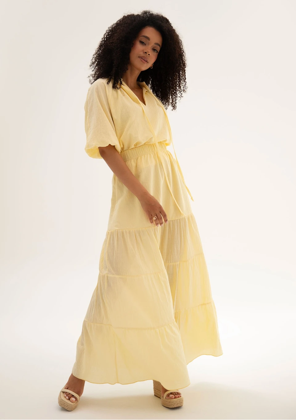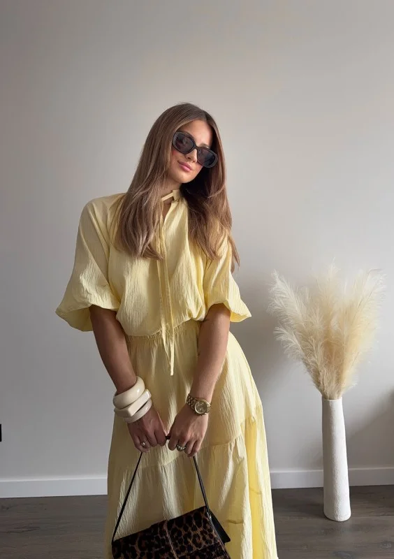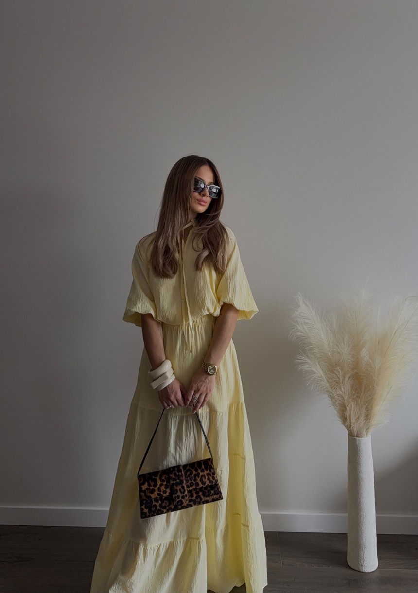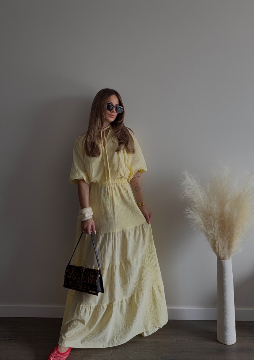 Lekka, zwiewna bluzka boho z cienkiej tkaniny bawełnianej. Wykonana w żółtym odcieniu. Fason z krótkim rękawem i wiązaną stójką.