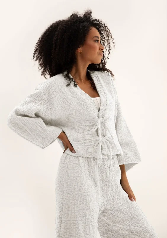 Absolutny must-have tego lata! Poznaj nasze lekkie i przewiewne kimono z muślinu o niezwykłej, teksturowanej fakturze, które zachwyca swobodą i elegancją. Ten fason z długim rękawem i uroczymi wiązaniami to kwintesencja letniego stylu, idealna na każdą okazję – od relaksu na plaży po wieczorne wyjścia.