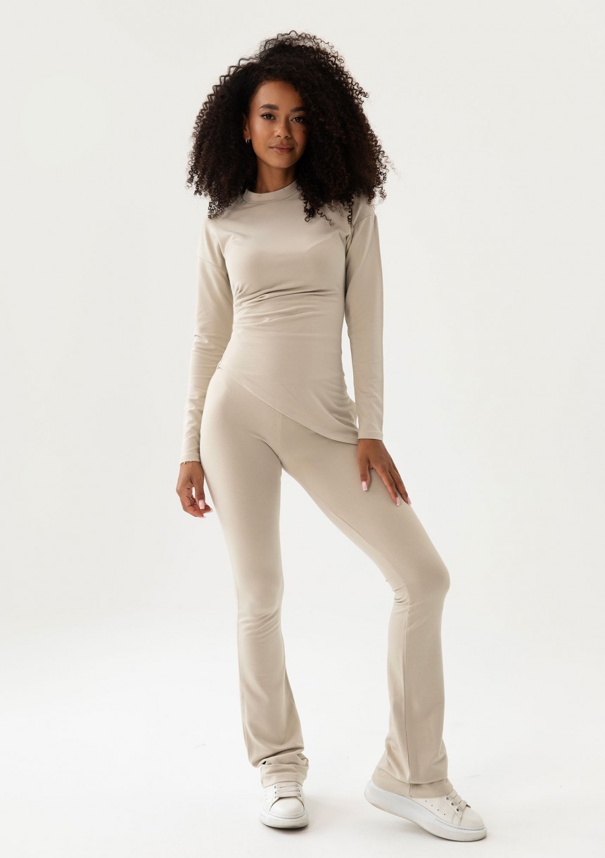 Stylowy top damski z wiskozy, wykonany w jasnym, beżowym kolorze. Model z długim rękawem, delikatnym drapowaniem i intrygującą asymetrią kroju.