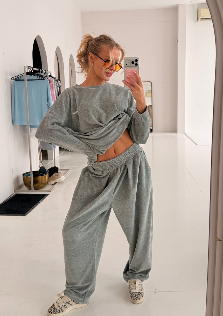 Miękki longsleeve z weluru. Stylowy fason w niezmiennie modnej formie oversize, wykonany we wszechstronnym, szarym kolorze z melanżowym deseniem.