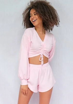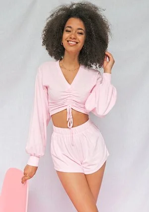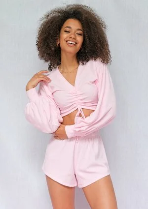 Przewiewny komplet to idealny wybór na letnie dni. Przede wszystkim dlatego, że jest bardzo uniwersalny i założyć można go na każdą okazję. Drugą kwestią jest unikatowy krój. Przede wszystkim komplet składa się z krótkich spodenek do połowy uda oraz oryginalnej bluzki z długim rękawem. Rękawy są dość oversize, co nadaje jej ciekawego charakteru. Mankiety natomiast są wąskie, dzięki czemu w tym miejscu są idealnie dopasowane. Góra posiada dekolt wycięty w kształcie litery V, co doskonale układa się na każdym rodzaju biustu. Pod biustem dodatkowo znajdują się ściągacze, dzięki którym bluzkę można znacząco podwinąć. Także spodenki mają stosunkowo luźny krój, ale w pasie posiadają szerszą gumkę, która dopasowuje je do ciała. Cały komplet wykonany jest w 100% z frotte, dzięki czemu jest miękki i przyjemny w dotyku. Delikatny różowy odcień jest prawdziwym hitem tego sezonu.
