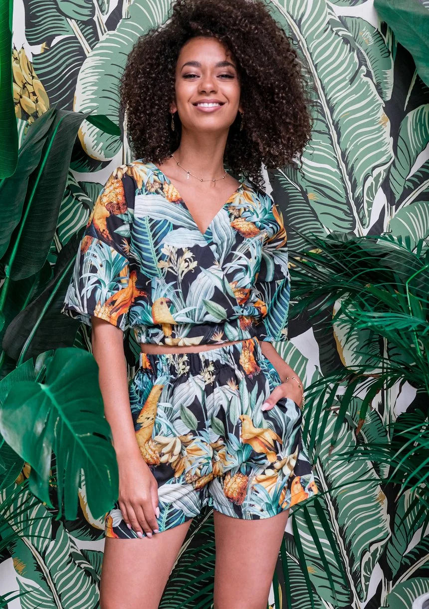 Damska bluzka z grafiką barwnych papug na tle soczyście zielonej tropikalnej roślinności to produkt uszyty w Polsce z wysoką starannością i dbałością o detale. Wykorzystana do stworzenia odzieży tkanina jest delikatna, przewiewna i rozciągliwa, czym dodatkowo zwiększa komfort noszenia tego elementu garderoby. Bluzka stanowi część kompletu, w którym łączy się ze spodenkami z wysokim stanem. Bez obaw można zakładać ją także osobno do innych stylizacji. W ciągu gorących letnich dni idealnie sprawdzi się w połączeniu ze zwiewną spódnicą lub innymi szortami. Z kolei podczas chłodniejszych wieczorów można założyć ją do klasycznych jeansów lub legginsów. Bluzeczka będzie doskonałą propozycją na spacer po mieście, zakupy, spotkanie z przyjaciółmi czy romantyczny wypad we dwoje.