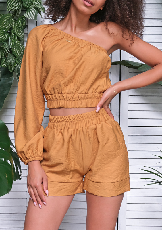 Asymetryczny top z kreszowany musztardowy