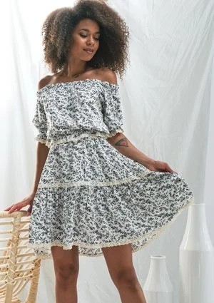Kobiecość jest zawsze na topie! Przekonaj się o tym razem z wyjątkową bluzką damską od Mosquito, w której poczujesz się pewna siebie! Top inspirowany jest koszulkami typu "hiszpanka". Szeroki dekolt wykończony elastyczną gumą utrzymuje się na ramionach, subtelnie eksponując obojczyki, ramiona i szyję. Nie trzeba obawiać się o jego niekontrolowane przesuwanie, czy nadmierne opinanie skóry - ściągacz dostosowany jest do delikatnego ciała pań. Bluzka sięga do talii. Tam, a także przy zakończeniu rękawów, wszyto delikatną, kremową koronkę, która doskonale wygląda w zestawieniu z bogato zdobioną tkaniną. Niebieski odcień topu podkreśla naturalną opaleniznę, a małe kwiatki na materialne dodają bluzce uroku. Całość wykończona została podwijanymi, krótkimi rękawami.