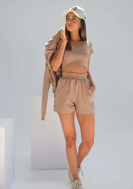 Krótki top w kawowym odcieniu sprawdzi się idealnie w sportowych stylizacjach w upalną pogodę. To model wykonany z elastycznej dzianiny bawełnianej. Jego minimalistyczny design uzupełnią dowolne szorty dresowe.