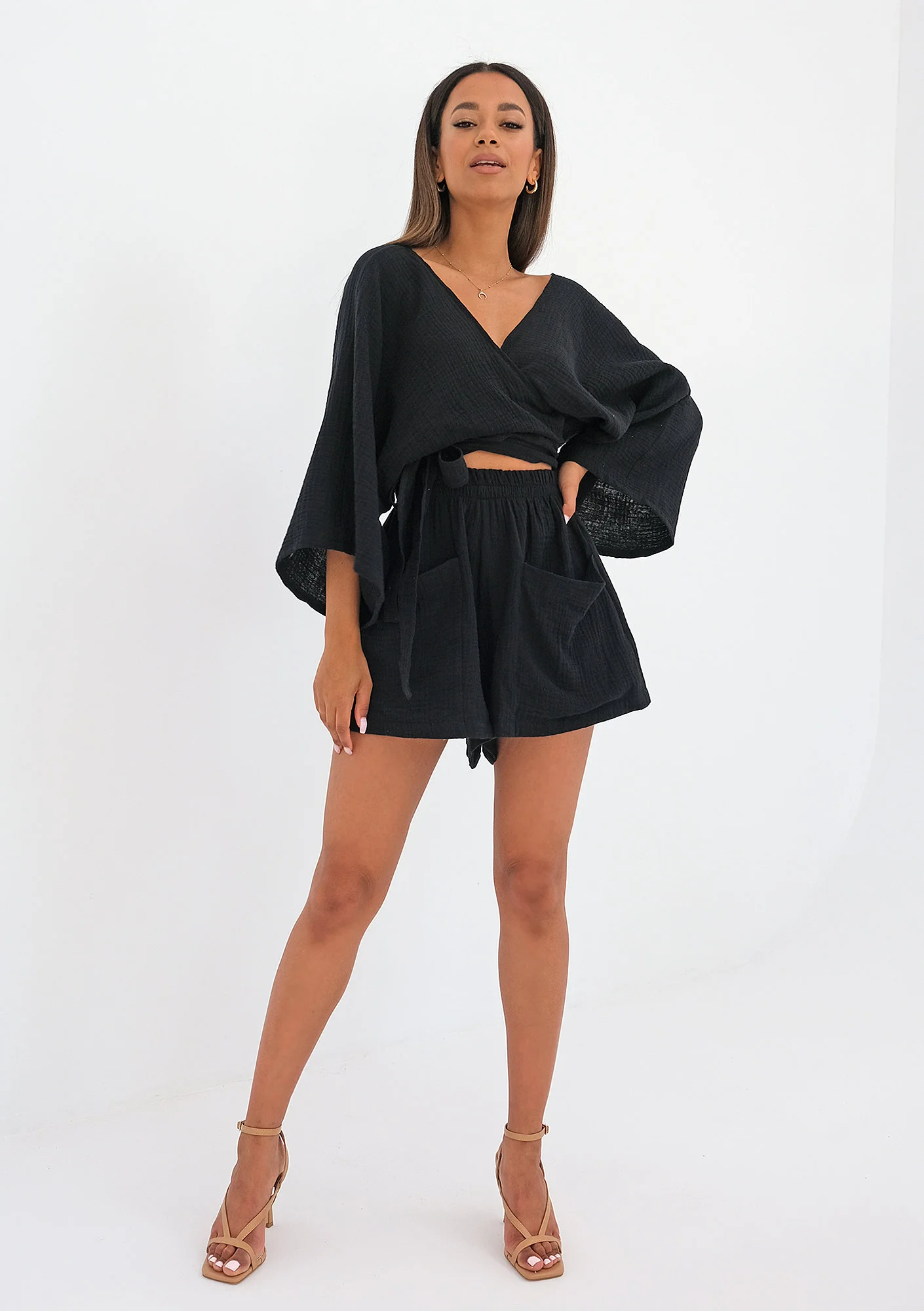 Czarny, krótki top damski oczaruje każdą miłośniczkę ciekawych fasonów i ponadczasowej, odpornej na zmieniające się trendy elegancji. Oryginalny krój to inspiracja klasycznym kimonem, ubraniem od wieków uważanych za wyjątkowe i na szczególne okazje. Czerń to uniwersalny kolor, dlatego top możesz łączyć z wieloma innymi odcieniami. Ubranie w pełni wyraża wakacyjny styl: jest wykonane z bardzo lekkiej tkaniny bawełnianej o fakturze muślinu. Bluzka jest zatem bardzo lekka, wręcz nie czuć jej na sobie! To szczególnie komfortowa kreacja na skwarny dzień, kiedy potrzebujesz wyglądać szykownie, a przy tym czuć się świeżo, aż do późnego wieczora.
