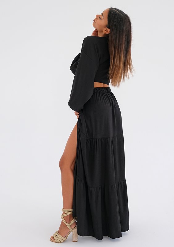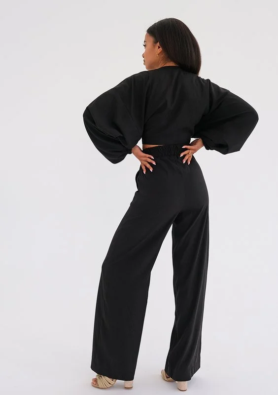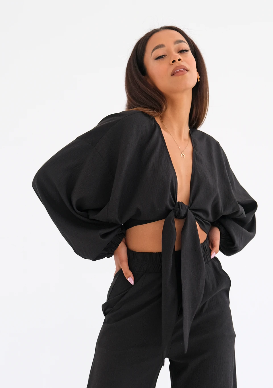 Czarny top z wiązaniem w lekkiej formie odsłoni talię i opalony dekolt. Wykonany ze zwiewnej tkaniny, idealny na słoneczne dni do spodni i szortów z wysokim stanem lub spódnic maxi w stylu boho.