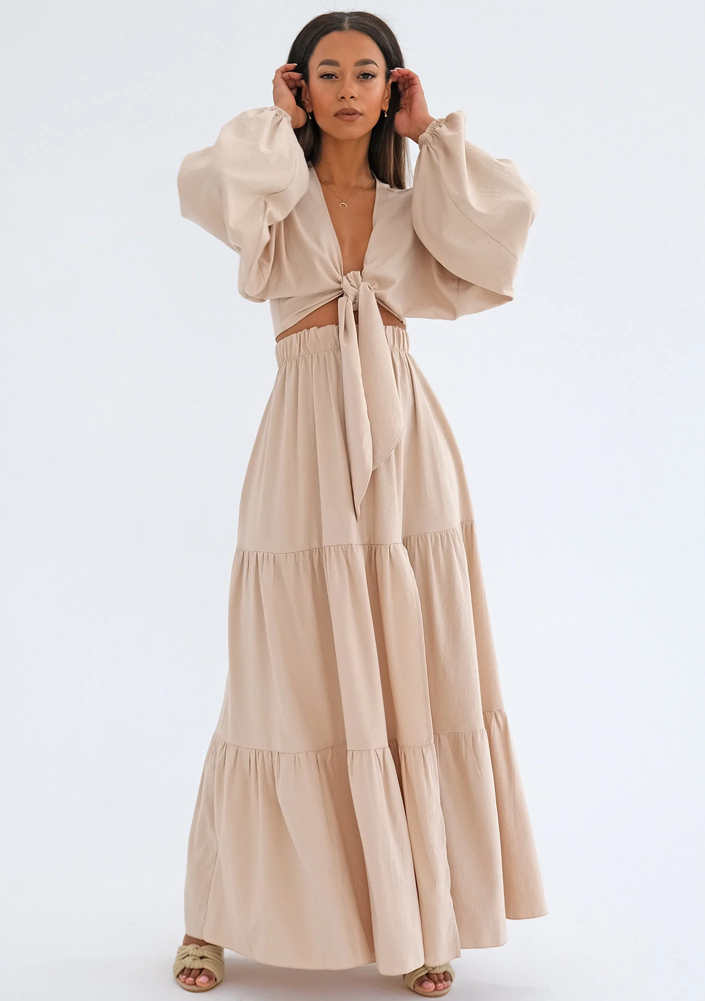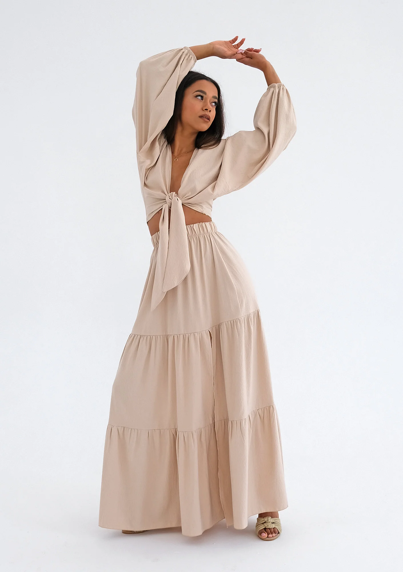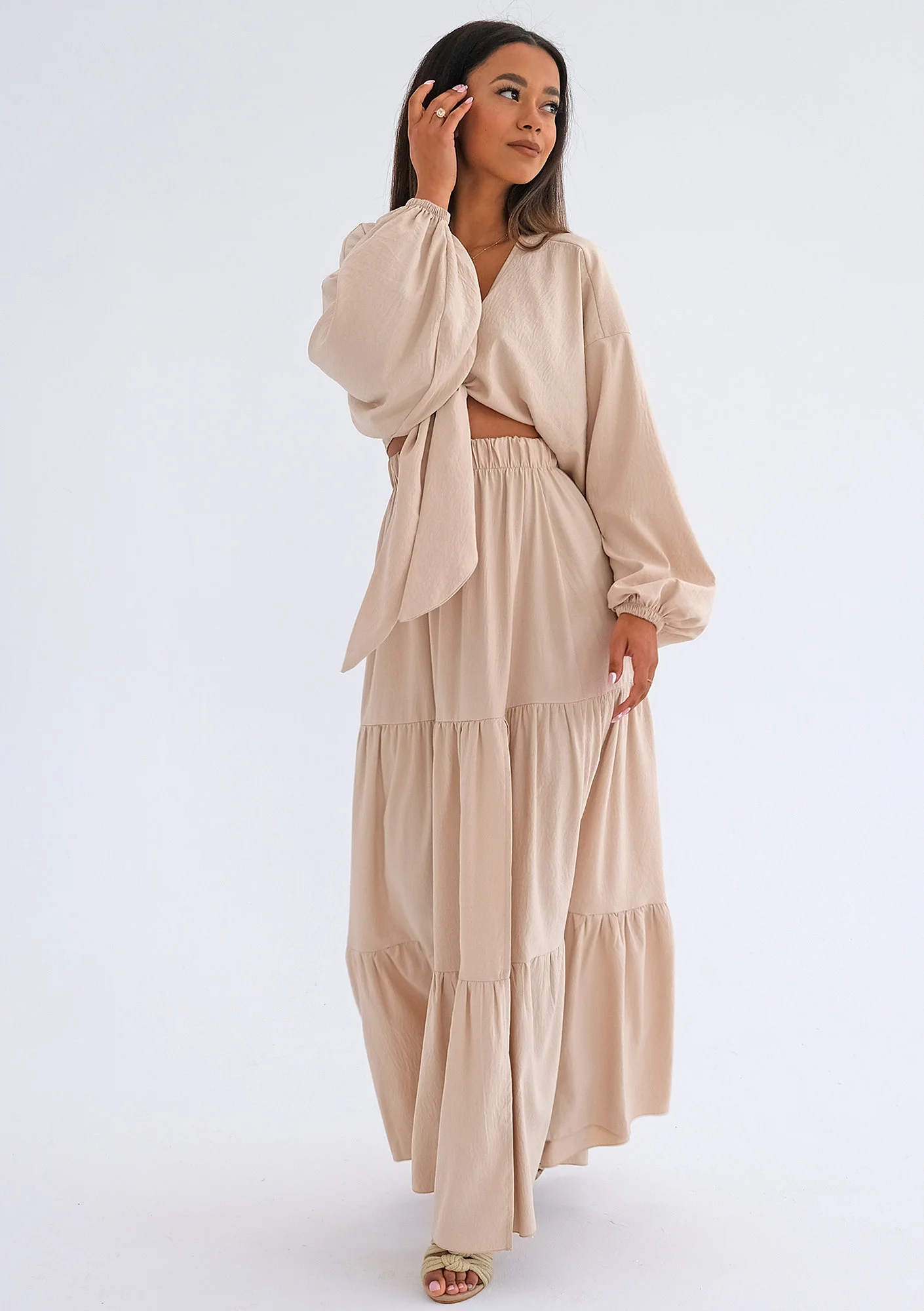 Wiązany, beżowy top damski to zmysłowa stylizacja na wiosenny i letni wypad. To nowość, o którą warto wzbogacić swoją garderobę – podkręci wiele zestawień: efektownie skomponuje się z najmodniejszymi, szerokimi spodniami, spódnicami w stylu boho, jak i uzupełni plażowe stylizacje z szortami. Gładkość koloru i zwiewność tkaniny nadaje mu lekkiego, naturalnego stylu, który warto przełamywać różnorodną oprawą akcesoriów i biżuterii. Dodatki etno, boho, słomkowe, eleganckie z futerkiem w stylu glamour – top zawsze będzie z nimi integralny.