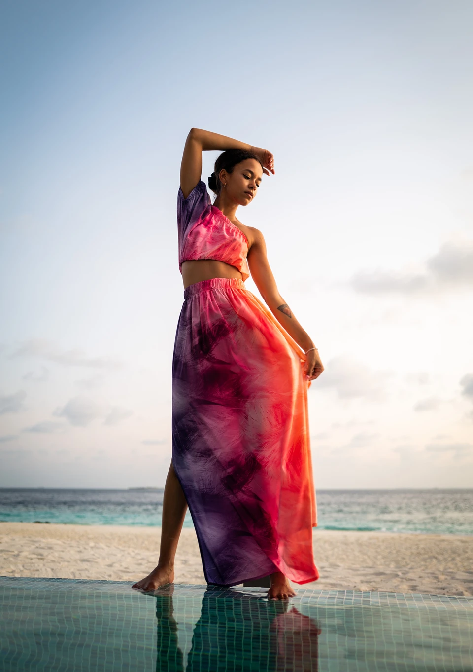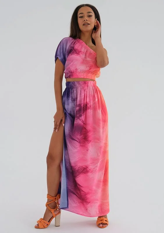 Wyjątkowy top na jedno ramię o barwnym wzorze ombre. Idealny fason na plażę, spotkanie koktajlowe i letnie imprezy. Świetnie uzupełnią go gładkie szorty i dżinsy. Skomponuj go ze spódnicą maxi dla efektownej całości.